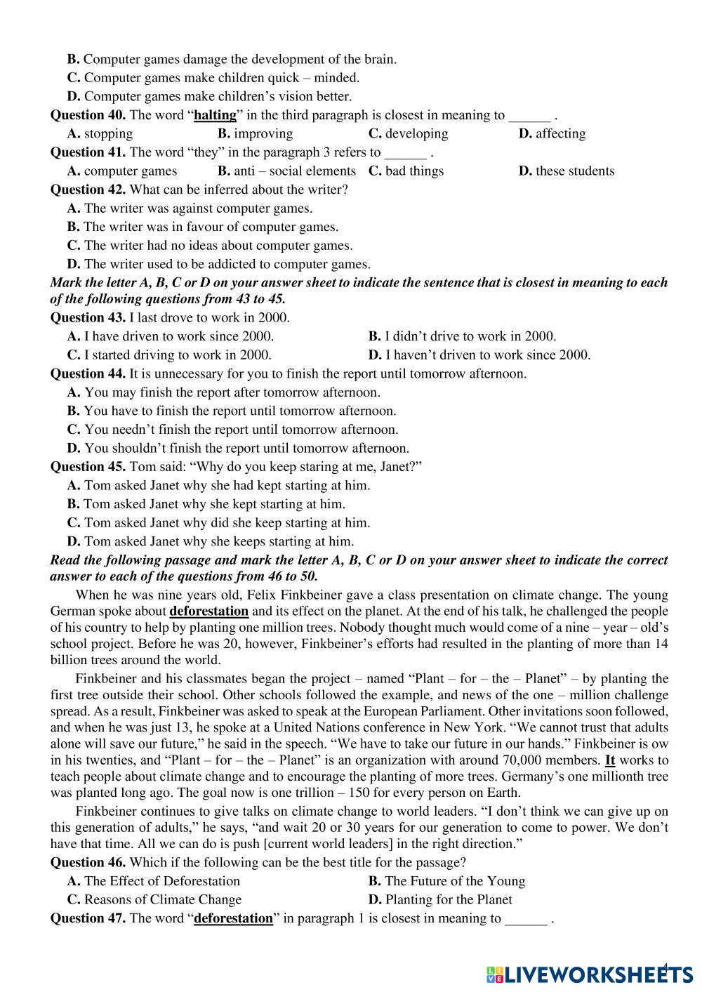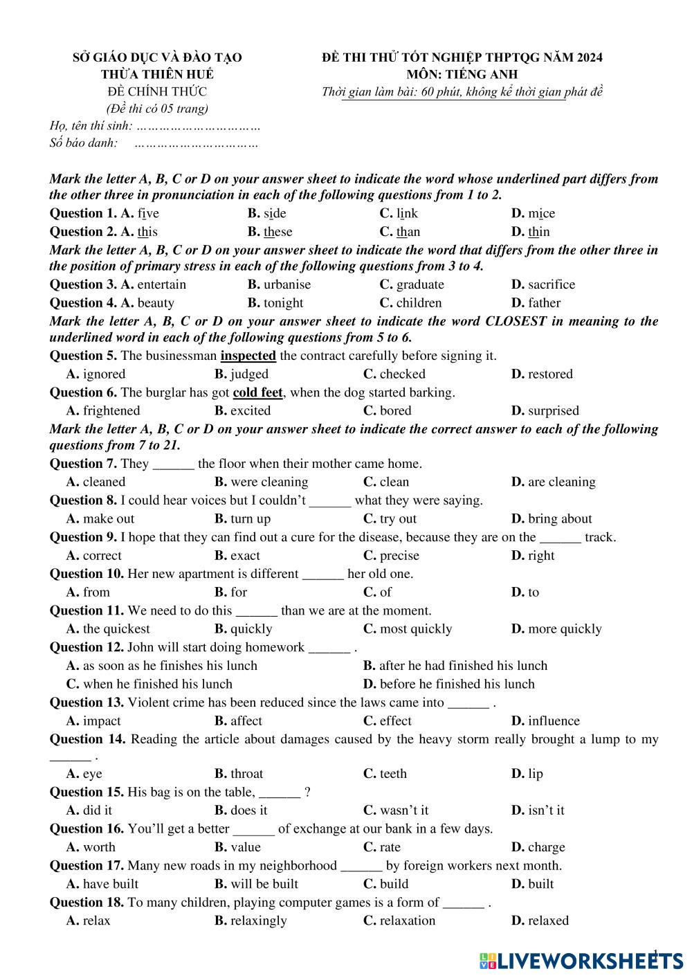 Created byNguyễn Thị MộngTuyền ENGLISH 12 THPT Age 17+ level: 12 English Author's Instructions My Google Classroom Courses × 0 classes selected (0 students total) Quick Access Select all classes (0 classes) All Classes Loading courses... ยกเลิก Share Share to selected Course __COURSE_NAME__ __STUDENT_NAME__ (__STUDENT_EMAIL__) THPT THỪA THIÊN HUẾ- 2024 ดาวน์โหลด Worksheet Validation Check my answers Emails my answers to my teacher ชื่อเต็ม Group/level School subject Teacher's email or key code Close ส่งข้อมูล Validating worksheet... (12) Your answers have been sent to your teacher. Good luck! OK We encountered an error submitting your answers. Please try again. OK โฆษณา | ใช้งานแบบไม่มีโฆษณา Created byNguyễn Thị MộngTuyền ENGLISH 12 THPT Age 17+ level: 12 English Author's Instructions