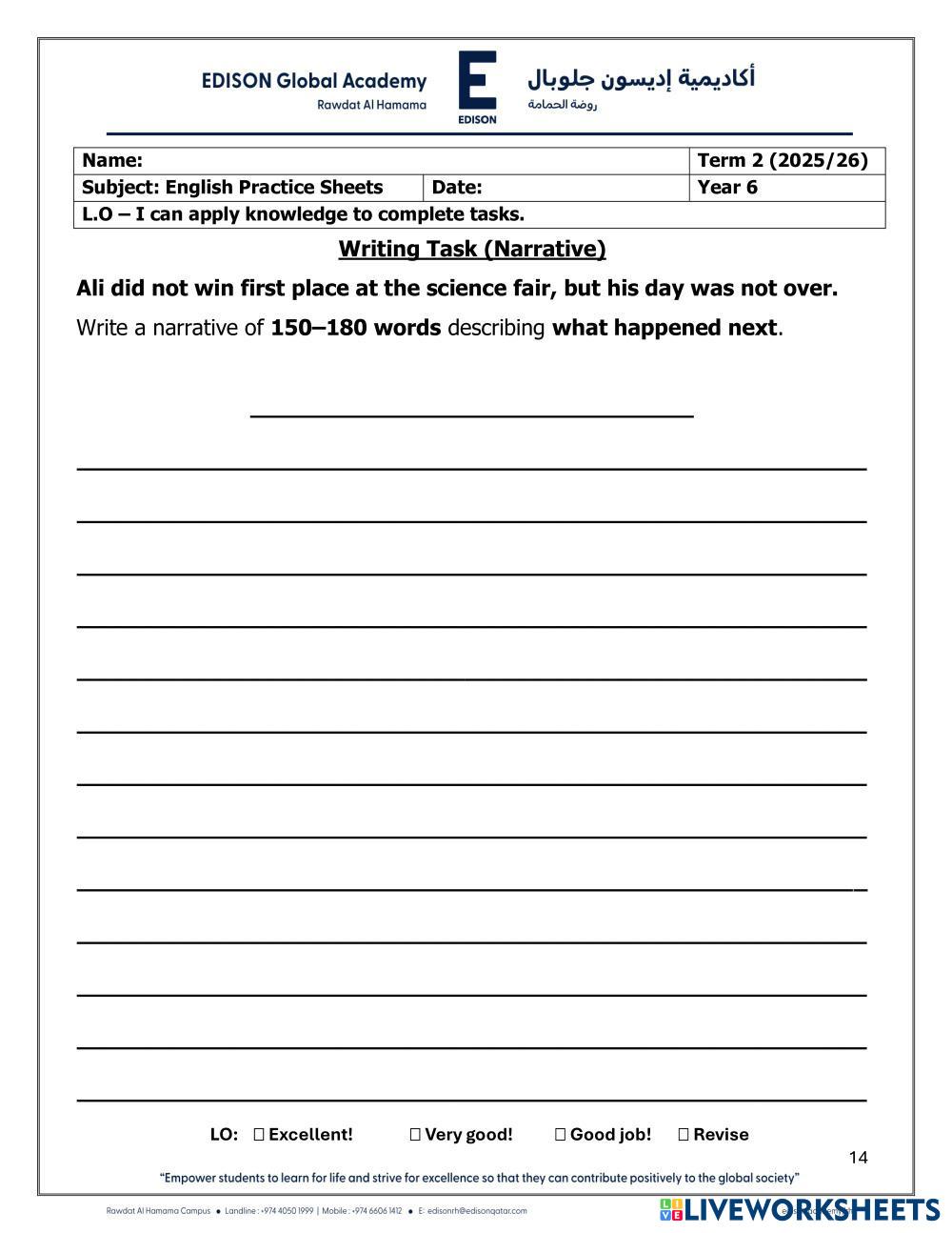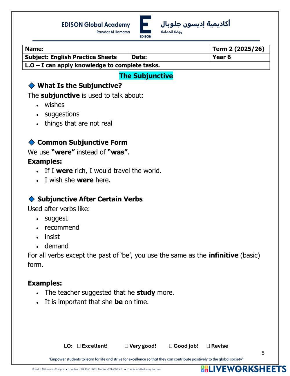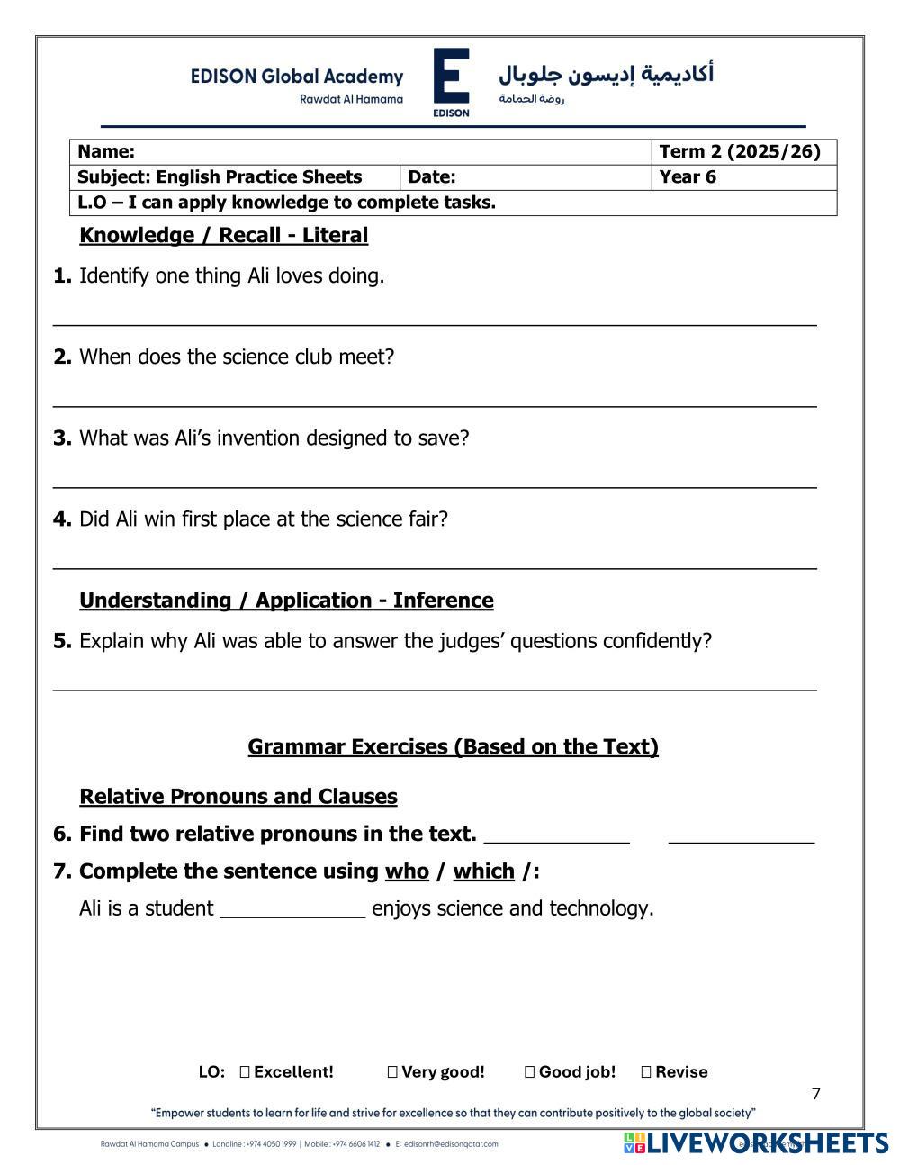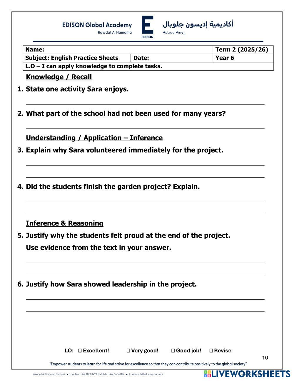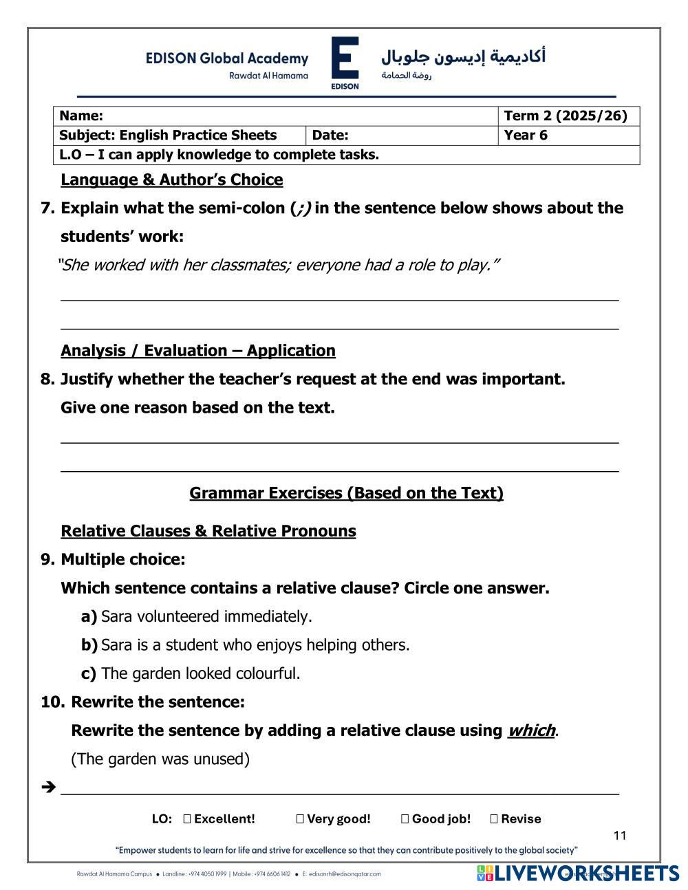 English Practice worksheet - Year 6 - Term 2