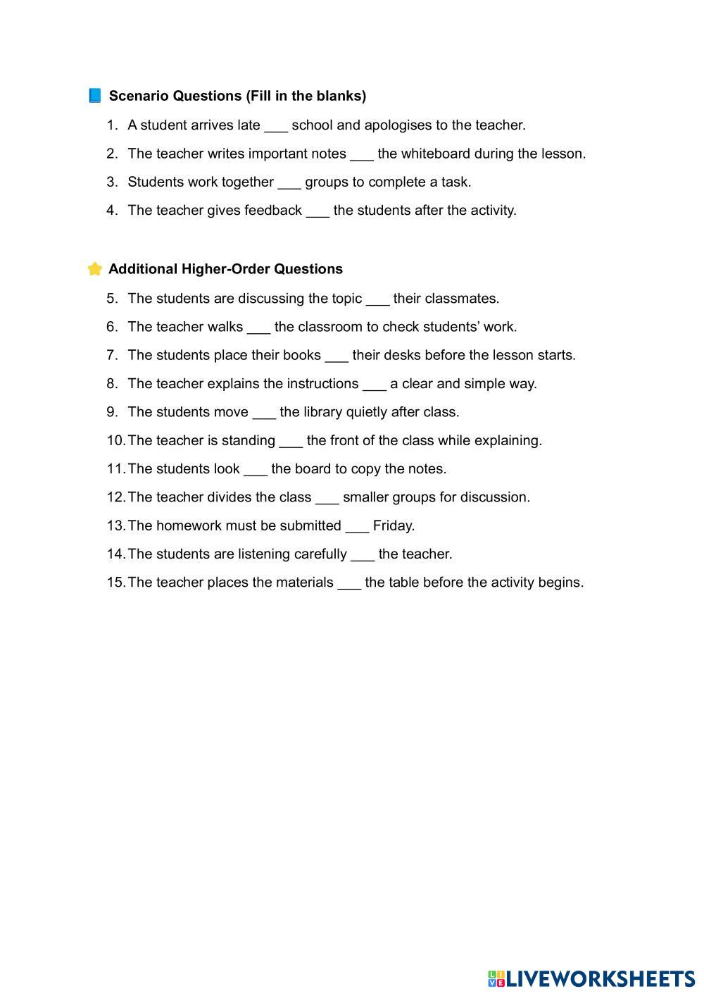 Read each classroom situation carefully and fill in the blanks with the most appropriate preposition.