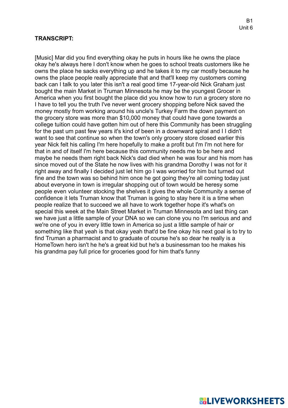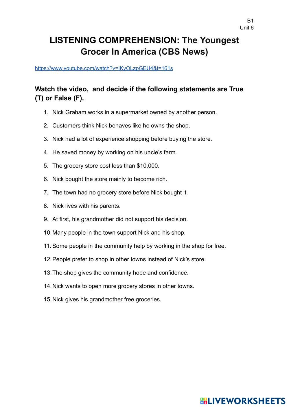Created by lpolo5 ภาษาอังกฤษ มัธยมศึกษาตอนปลาย ม.6 (มัธยมศึกษาปีที่ 6) การค้นคว้า English คำแนะนำของผู้เขียน Watch the video, and decide if the following statements are True (T) or False (F). My Google Classroom Courses × 0 classes selected (0 students total) Quick Access Select all classes (0 classes) All Classes Loading courses... ยกเลิก Share Share to selected Course __COURSE_NAME__ __STUDENT_NAME__ (__STUDENT_EMAIL__) LISTENING COMPREHENSION: The Youngest Grocer In America (CBS News) ดาวน์โหลด Worksheet Validation Check my answers Emails my answers to my teacher ชื่อเต็ม Group/level School subject Teacher's email or key code Close ส่งข้อมูล Validating worksheet... (12) Your answers have been sent to your teacher. Good luck! OK We encountered an error submitting your answers. Please try again. OK โฆษณา | ใช้งานแบบไม่มีโฆษณา Created by lpolo5 ภาษาอังกฤษ มัธยมศึกษาตอนปลาย ม.6 (มัธยมศึกษาปีที่ 6) การค้นคว้า English คำแนะนำของผู้เขียน Watch the video, and decide if the following statements are True (T) or False (F). สำรวจแผ่นงาน 汉语模拟考试 3 English Language 12th grade 汉语模拟考试 3 Research - English Language 汉语模拟考试 3 TKT unit 23 - Consulting reference resources English Language 12th grade TKT unit 23 - Consulting reference resources Research - English Language Drag and drop the reference resources in the box with the reasons for using them below. REPORTED SPEECH STATEMENTS/QUESTIONS/COMMANDS English Language 12th grade REPORTED SPEECH STATEMENTS/QUESTIONS/COMMANDS Research - English Language Write the following sentences in Reported Speech. LISTENING SECTION-Healthy Eating Habits English Language 12th grade LISTENING SECTION-Healthy Eating Habits Research - English Language Students will develop their listening comprehension skills by identifying specific information, main ideas, and opinions about healthy eating.