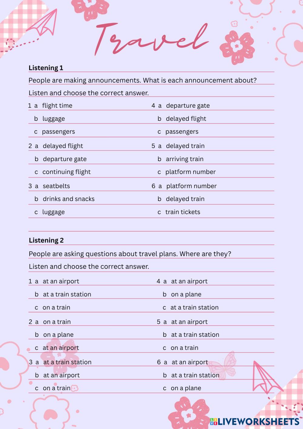 Created by Scatty English Language Middle School 6th grade Vocabulary English Author's Instructions Listen and choose the correct answer. My Google Classroom Courses × 0 classes selected (0 students total) Quick Access Select all classes (0 classes) All Classes Loading courses... ยกเลิก Share Share to selected Course __COURSE_NAME__ __STUDENT_NAME__ (__STUDENT_EMAIL__) Listening Practice - Travel ดาวน์โหลด Worksheet Validation Check my answers Emails my answers to my teacher ชื่อเต็ม Group/level School subject Teacher's email or key code Close ส่งข้อมูล Validating worksheet... (12) Your answers have been sent to your teacher. Good luck! OK We encountered an error submitting your answers. Please try again. OK โฆษณา | ใช้งานแบบไม่มีโฆษณา Created by Scatty English Language Middle School 6th grade Vocabulary English Author's Instructions Listen and choose the correct answer. Explore Worksheets Go for 1t!6 UNITS 1-3 English Language 6th grade Go for 1t!6 UNITS 1-3 Vocabulary - English Language Tee tehtävät annettujen ohjeiden mukaan. G6 M3 Phonics - WB ACT 3 English Language 6th grade G6 M3 Phonics - WB ACT 3 Vocabulary - English Language Unscramble and write. ALSÓNEMŰ/NADRÁGOK English Language 6th grade ALSÓNEMŰ/NADRÁGOK Vocabulary - English Language 1 Bài tập 2 English Language 6th grade Bài tập 2 Vocabulary - English Language a