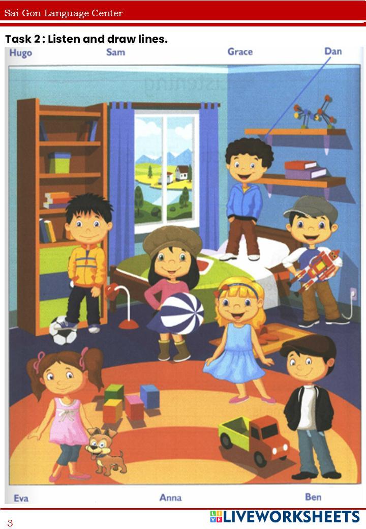 Câu 1: Listen and draw lines. (Nghe và nối)