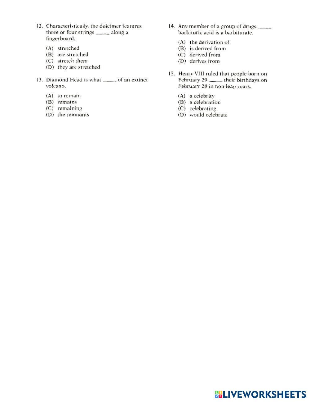 Created by Sergemar ภาษาอังกฤษ มัธยมศึกษาตอนปลาย ม.6 (มัธยมศึกษาปีที่ 6) คำศัพท์ English คำแนะนำของผู้เขียน . My Google Classroom Courses × 0 classes selected (0 students total) Quick Access Select all classes (0 classes) All Classes Loading courses... ยกเลิก Share Share to selected Course __COURSE_NAME__ __STUDENT_NAME__ (__STUDENT_EMAIL__) Structure and written expression ดาวน์โหลด Worksheet Validation Check my answers Emails my answers to my teacher ชื่อเต็ม Group/level School subject Teacher's email or key code Close ส่งข้อมูล Validating worksheet... (12) Your answers have been sent to your teacher. Good luck! OK We encountered an error submitting your answers. Please try again. OK โฆษณา | ใช้งานแบบไม่มีโฆษณา Created by Sergemar ภาษาอังกฤษ มัธยมศึกษาตอนปลาย ม.6 (มัธยมศึกษาปีที่ 6) คำศัพท์ English คำแนะนำของผู้เขียน . สำรวจแผ่นงาน 4D English Language 12th grade 4D Vocabulary - English Language should Matura rozszerzona czerwiec 2025 English Language 12th grade Matura rozszerzona czerwiec 2025 Vocabulary - English Language Do the tasks LEVEL 3 UNIT 11A English Language 12th grade LEVEL 3 UNIT 11A Vocabulary - English Language Read the instructions carefully B WHAT U WANNA B English Language 12th grade B WHAT U WANNA B Vocabulary - English Language Fill the correct words into the blanks