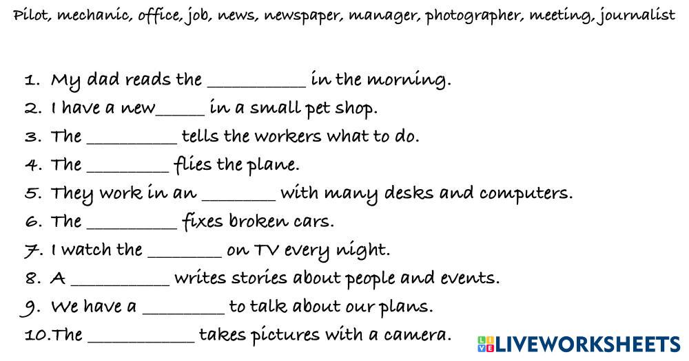 Created by JodieTF ภาษาอังกฤษ ประถมศึกษา ป.4 (ประถมศึกษาปีที่ 4) คำศัพท์ English คำแนะนำของผู้เขียน Fill in the gaps with the correct words My Google Classroom Courses × 0 classes selected (0 students total) Quick Access Select all classes (0 classes) All Classes Loading courses... ยกเลิก Share Share to selected Course __COURSE_NAME__ __STUDENT_NAME__ (__STUDENT_EMAIL__) Jobs 3 - 3th March 2026 ดาวน์โหลด Worksheet Validation Check my answers Emails my answers to my teacher ชื่อเต็ม Group/level School subject Teacher's email or key code Close ส่งข้อมูล Validating worksheet... (12) Your answers have been sent to your teacher. Good luck! OK We encountered an error submitting your answers. Please try again. OK โฆษณา | ใช้งานแบบไม่มีโฆษณา Created by JodieTF ภาษาอังกฤษ ประถมศึกษา ป.4 (ประถมศึกษาปีที่ 4) คำศัพท์ English คำแนะนำของผู้เขียน Fill in the gaps with the correct words สำรวจแผ่นงาน KIDS 4 - UNIT 1 English Language 4th grade KIDS 4 - UNIT 1 Vocabulary - English Language LISTEN AND REPEAT Magic paper English Language 4th grade Magic paper Vocabulary - English Language the children should match the pictures with the corresponding job titles the orders should be mixed up FF4_06.03 English Language 4th grade FF4_06.03 Vocabulary - English Language age 9-10 FF4_U11L1+2_05.03 English Language 4th grade FF4_U11L1+2_05.03 Vocabulary - English Language age 9-10
