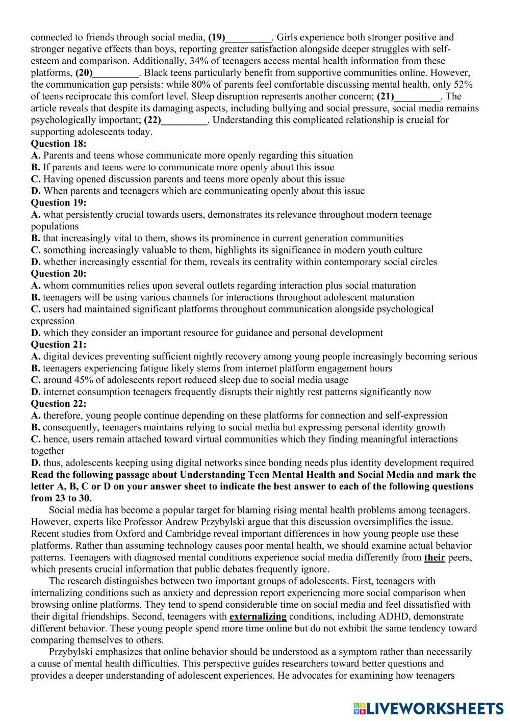 Created byĐặng Thành Đạt ภาษาอังกฤษ มัธยมศึกษาตอนปลาย ม.6 (มัธยมศึกษาปีที่ 6) คำศัพท์ English คำแนะนำของผู้เขียน rr My Google Classroom Courses × 0 classes selected (0 students total) Quick Access Select all classes (0 classes) All Classes Loading courses... ยกเลิก Share Share to selected Course __COURSE_NAME__ __STUDENT_NAME__ (__STUDENT_EMAIL__) Đề 1 vip ดาวน์โหลด Worksheet Validation Check my answers Emails my answers to my teacher ชื่อเต็ม Group/level School subject Teacher's email or key code Close ส่งข้อมูล Validating worksheet... (12) Your answers have been sent to your teacher. Good luck! OK We encountered an error submitting your answers. Please try again. OK โฆษณา | ใช้งานแบบไม่มีโฆษณา Created byĐặng Thành Đạt ภาษาอังกฤษ มัธยมศึกษาตอนปลาย ม.6 (มัธยมศึกษาปีที่ 6) คำศัพท์ English คำแนะนำของผู้เขียน rr สำรวจแผ่นงาน AV3_Progress Test 2_Listening English Language 12th grade AV3_Progress Test 2_Listening Vocabulary - English Language Listen and choose the correct options. Bubble sheet English Language 12th grade Bubble sheet Vocabulary - English Language complete Superlative and Comparative Adjectives English Language 12th grade Superlative and Comparative Adjectives Vocabulary - English Language Complete the gaps with the correct superlative or comparative. Adverbs vs. Adjectives English Language 12th grade Adverbs vs. Adjectives Vocabulary - English Language Do the following exercises