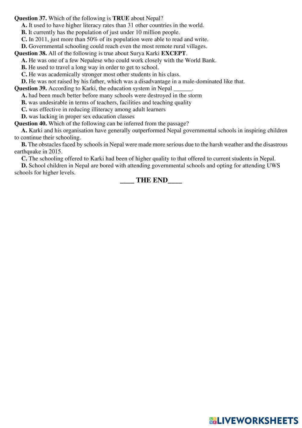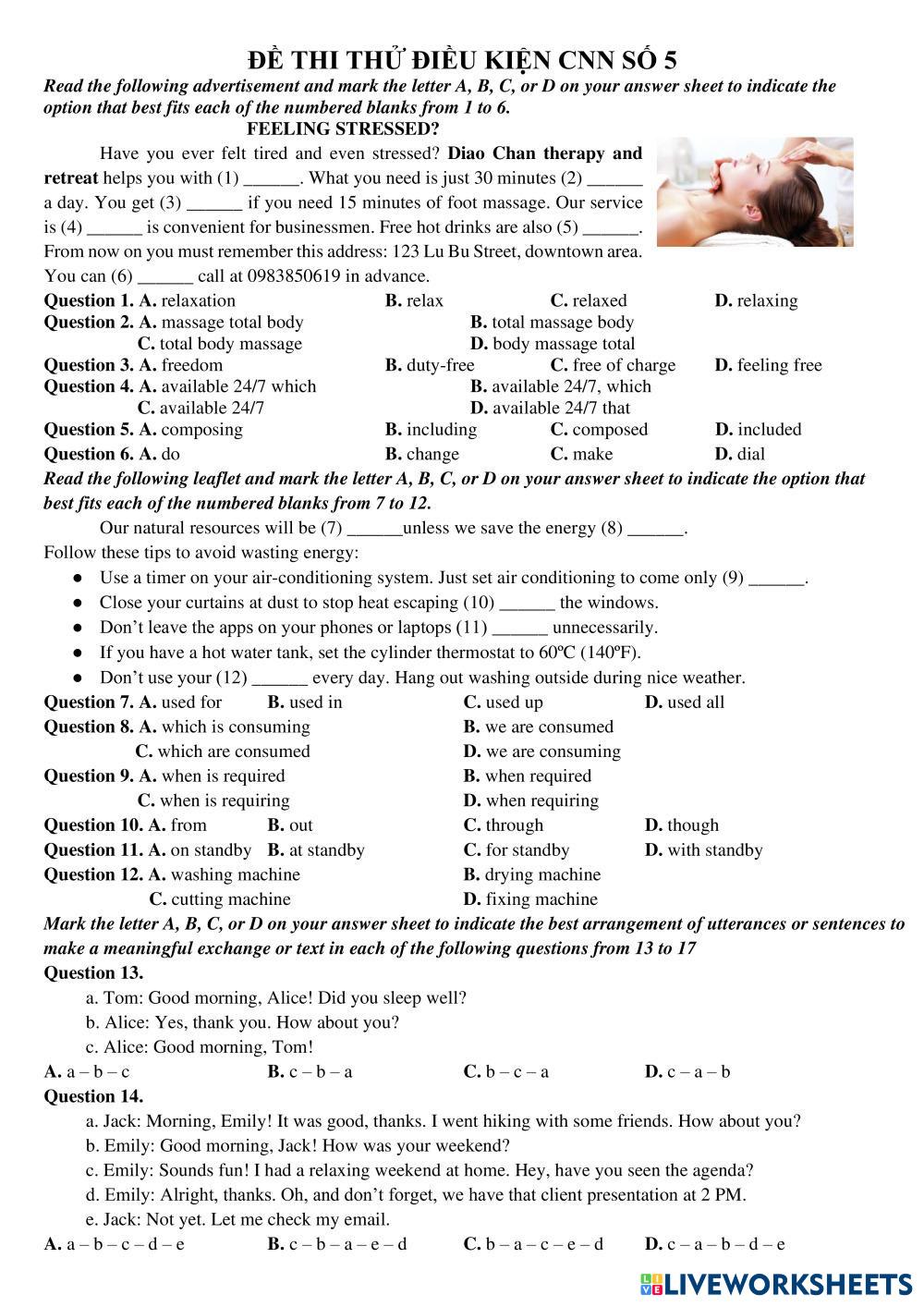 Created bynguyen ngoc anh ภาษาอังกฤษ มัธยมศึกษาตอนปลาย ม.3 (มัธยมศึกษาปีที่ 3) การเขียน English คำแนะนำของผู้เขียน practice My Google Classroom Courses × 0 classes selected (0 students total) Quick Access Select all classes (0 classes) All Classes Loading courses... ยกเลิก Share Share to selected Course __COURSE_NAME__ __STUDENT_NAME__ (__STUDENT_EMAIL__) ĐỀ THI THỬ ĐIỀU KIỆN SỐ 5 ดาวน์โหลด Worksheet Validation Check my answers Emails my answers to my teacher ชื่อเต็ม Group/level School subject Teacher's email or key code Close ส่งข้อมูล Validating worksheet... (12) Your answers have been sent to your teacher. Good luck! OK We encountered an error submitting your answers. Please try again. OK โฆษณา | ใช้งานแบบไม่มีโฆษณา Created bynguyen ngoc anh ภาษาอังกฤษ มัธยมศึกษาตอนปลาย ม.3 (มัธยมศึกษาปีที่ 3) การเขียน English คำแนะนำของผู้เขียน practice สำรวจแผ่นงาน EVALUATION 9TH English Language 9th grade EVALUATION 9TH Writing - English Language Read with carefully each question PRESENT SIMPLE & PAST SIMPLE - MIXED EXERCISES English Language 9th grade PRESENT SIMPLE & PAST SIMPLE - MIXED EXERCISES Writing - English Language Do the following exercises about present simple and past simple. Temporals in the futute English Language 9th grade Temporals in the futute Writing - English Language Watch the video and rewrite the swntences using the temporals in brackets. Temporals in the futute English Language 9th grade Temporals in the futute Writing - English Language Watch the video and rewrite the sentences using the temporals in brackets.