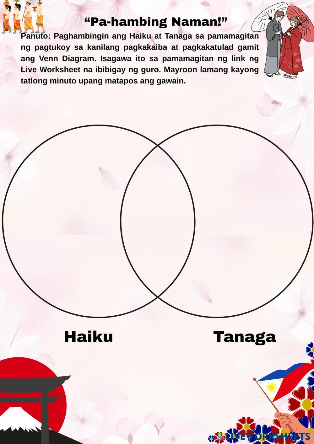 Panuto: Paghambingin ang Haiku at Tanaga sa pamamagitan ng pagtukoy sa kanilang pagkakaiba at pagkakatulad gamit ang Venn Diagram. Isagawa ito sa pamamagitan ng link ng Live Worksheet na ibibigay ng guro. Mayroon lamang kayong tatlong minuto upang matapos ang gawain.