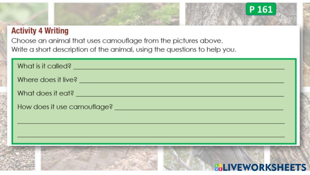 Choose an animal that uses camouflage from the pictures above. Write a short description of the animal, using the questions to help you.