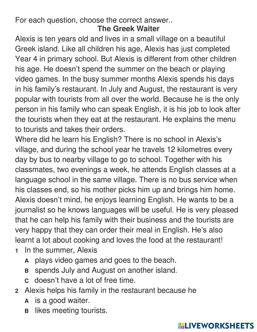 Created byTA Day Kem - A2 English language The Greek Waiter Age 12-15 level: 6-8 English คำแนะนำของผู้เขียน My Google Classroom Courses × 0 classes selected (0 students total) Quick Access Select all classes (0 classes) All Classes Loading courses... ยกเลิก Share Share to selected Course __COURSE_NAME__ __STUDENT_NAME__ (__STUDENT_EMAIL__) The Greek Waiter – A2 English Reading Test ดาวน์โหลด Worksheet Validation Check my answers Emails my answers to my teacher ชื่อเต็ม Group/level School subject Teacher's email or key code Close ส่งข้อมูล Validating worksheet... (12) Your answers have been sent to your teacher. Good luck! OK We encountered an error submitting your answers. Please try again. OK โฆษณา | ใช้งานแบบไม่มีโฆษณา Created byTA Day Kem - A2 English language The Greek Waiter Age 12-15 level: 6-8 English คำแนะนำของผู้เขียน
