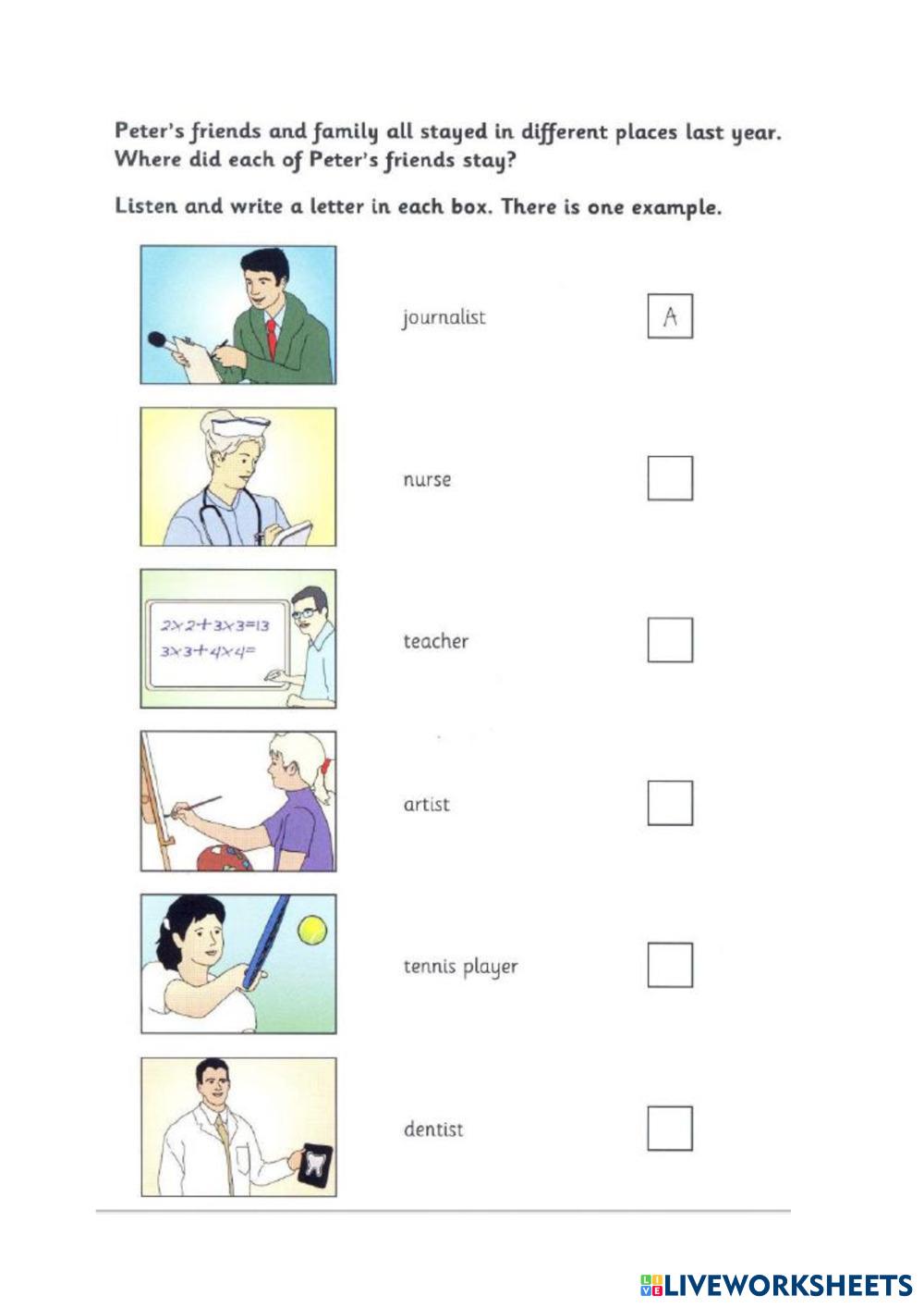 Created by melin123 English as a Second Language (ESL) Listening comprehension Age 9 level: A2 English คำแนะนำของผู้เขียน My Google Classroom Courses × 0 classes selected (0 students total) Quick Access Select all classes (0 classes) All Classes Loading courses... ยกเลิก Share Share to selected Course __COURSE_NAME__ __STUDENT_NAME__ (__STUDENT_EMAIL__) F Listening Test 2 Part 2 ดาวน์โหลด Worksheet Validation Check my answers Emails my answers to my teacher ชื่อเต็ม Group/level School subject Teacher's email or key code Close ส่งข้อมูล Validating worksheet... (12) Your answers have been sent to your teacher. Good luck! OK We encountered an error submitting your answers. Please try again. OK โฆษณา | ใช้งานแบบไม่มีโฆษณา Created by melin123 English as a Second Language (ESL) Listening comprehension Age 9 level: A2 English คำแนะนำของผู้เขียน