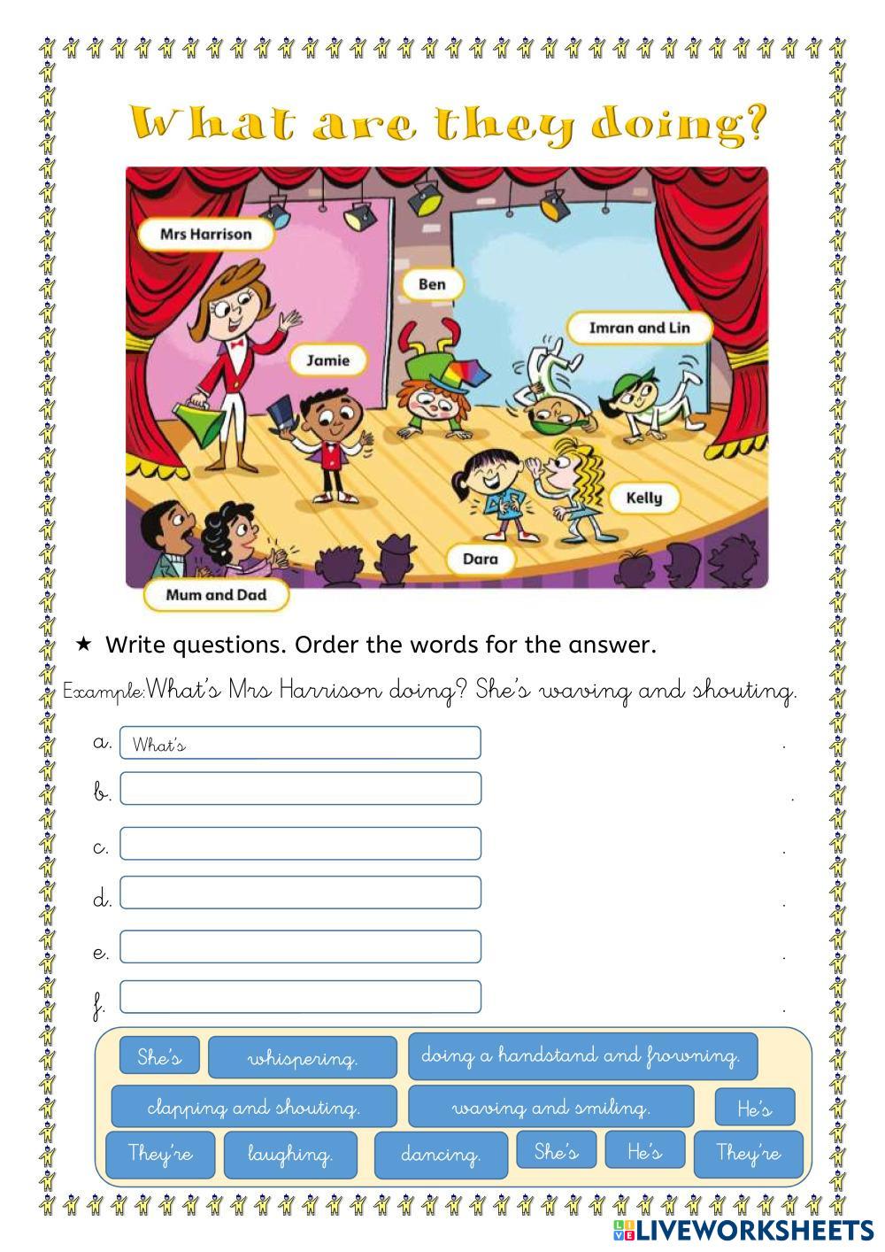 Write questions and answers about what they are doing.