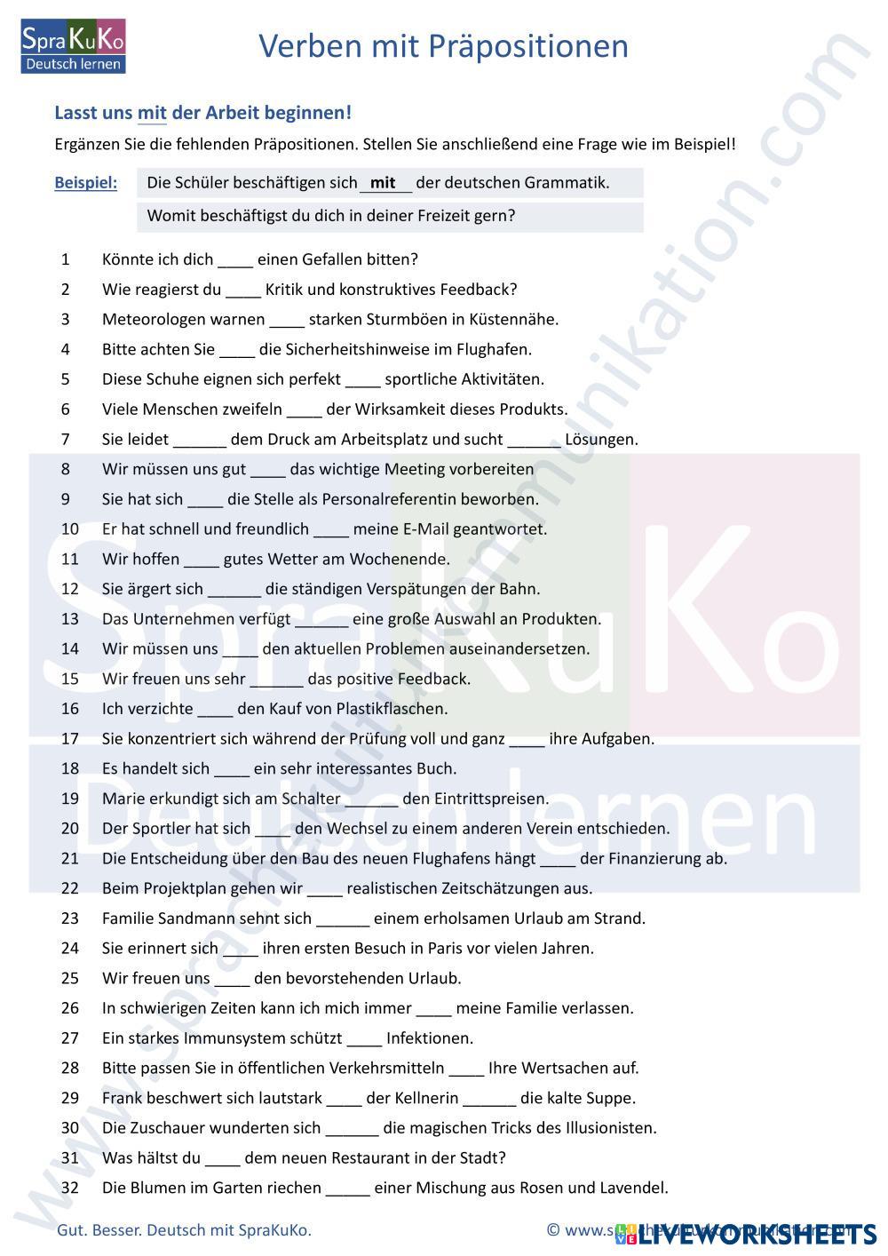 Created byEva Šivicová German Grammatik Age 15+ level: B1 German Author's Instructions My Google Classroom Courses × 0 classes selected (0 students total) Quick Access Select all classes (0 classes) All Classes Loading courses... ยกเลิก Share Share to selected Course __COURSE_NAME__ __STUDENT_NAME__ (__STUDENT_EMAIL__) Verben und ihre Präpositionen ดาวน์โหลด Worksheet Validation Check my answers Emails my answers to my teacher ชื่อเต็ม Group/level School subject Teacher's email or key code Close ส่งข้อมูล Validating worksheet... (12) Your answers have been sent to your teacher. Good luck! OK We encountered an error submitting your answers. Please try again. OK โฆษณา | ใช้งานแบบไม่มีโฆษณา Created byEva Šivicová German Grammatik Age 15+ level: B1 German Author's Instructions