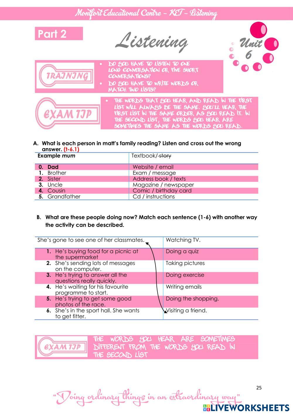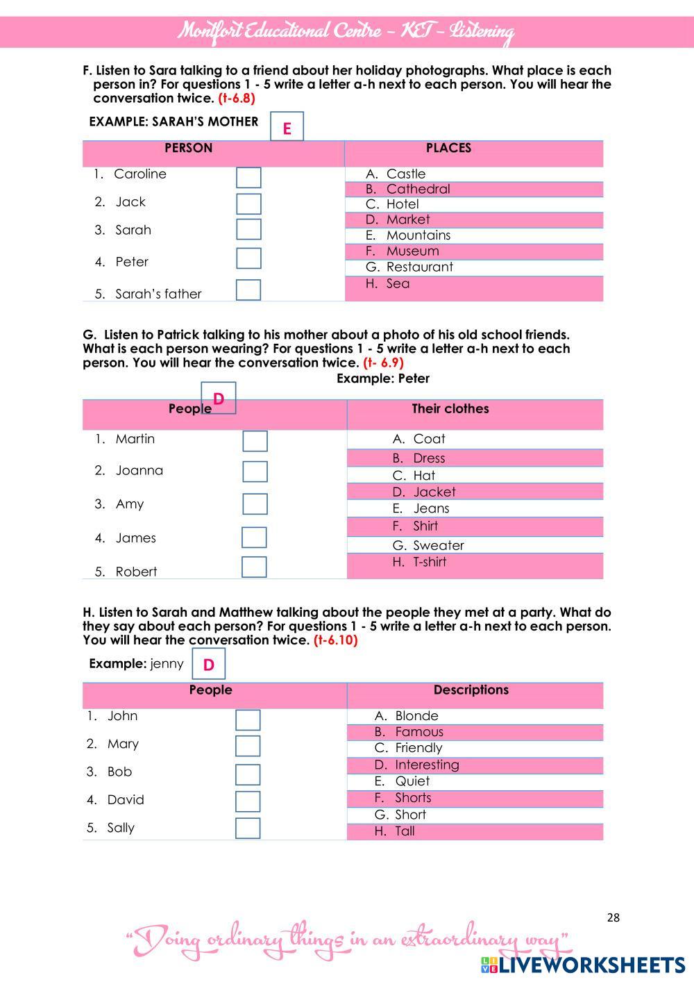 Created byMontfort Educational School English as a Second Language (ESL) Listening comprehension Age 3+ level: ALL English คำแนะนำของผู้เขียน KET LISTENING UNIT 6 My Google Classroom Courses × 0 classes selected (0 students total) Quick Access Select all classes (0 classes) All Classes Loading courses... ยกเลิก Share Share to selected Course __COURSE_NAME__ __STUDENT_NAME__ (__STUDENT_EMAIL__) KET LISTENING UNIT 6 ดาวน์โหลด Worksheet Validation Check my answers Emails my answers to my teacher ชื่อเต็ม Group/level School subject Teacher's email or key code Close ส่งข้อมูล Validating worksheet... (12) Your answers have been sent to your teacher. Good luck! OK We encountered an error submitting your answers. Please try again. OK โฆษณา | ใช้งานแบบไม่มีโฆษณา Created byMontfort Educational School English as a Second Language (ESL) Listening comprehension Age 3+ level: ALL English คำแนะนำของผู้เขียน KET LISTENING UNIT 6