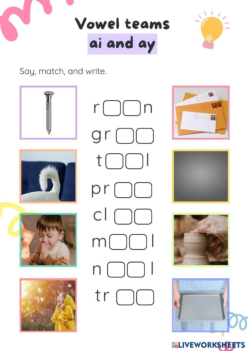 Created byStefanie Sarmento English as a Second Language (ESL) Vowel teams Age 7-15 level: A1 English คำแนะนำของผู้เขียน My Google Classroom Courses × 0 classes selected (0 students total) Quick Access Select all classes (0 classes) All Classes Loading courses... ยกเลิก Share Share to selected Course __COURSE_NAME__ __STUDENT_NAME__ (__STUDENT_EMAIL__) Vowel teams (ai & ay) ดาวน์โหลด Worksheet Validation Check my answers Emails my answers to my teacher ชื่อเต็ม Group/level School subject Teacher's email or key code Close ส่งข้อมูล Validating worksheet... (12) Your answers have been sent to your teacher. Good luck! OK We encountered an error submitting your answers. Please try again. OK โฆษณา | ใช้งานแบบไม่มีโฆษณา Created byStefanie Sarmento English as a Second Language (ESL) Vowel teams Age 7-15 level: A1 English คำแนะนำของผู้เขียน