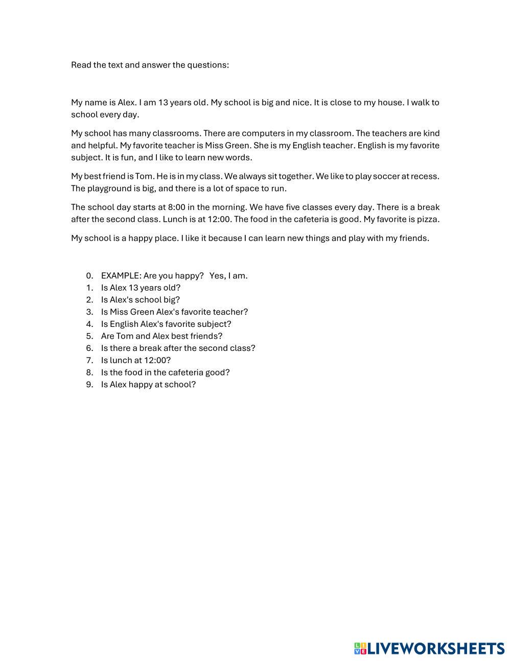Created by mcamila English as a Second Language (ESL) Verb to be Age 10+ level: A1 English คำแนะนำของผู้เขียน My Google Classroom Courses × 0 classes selected (0 students total) Quick Access Select all classes (0 classes) All Classes Loading courses... ยกเลิก Share Share to selected Course __COURSE_NAME__ __STUDENT_NAME__ (__STUDENT_EMAIL__) Reading yes- no questions verb to be ดาวน์โหลด Worksheet Validation Check my answers Emails my answers to my teacher ชื่อเต็ม Group/level School subject Teacher's email or key code Close ส่งข้อมูล Validating worksheet... (12) Your answers have been sent to your teacher. Good luck! OK We encountered an error submitting your answers. Please try again. OK โฆษณา | ใช้งานแบบไม่มีโฆษณา Created by mcamila English as a Second Language (ESL) Verb to be Age 10+ level: A1 English คำแนะนำของผู้เขียน
