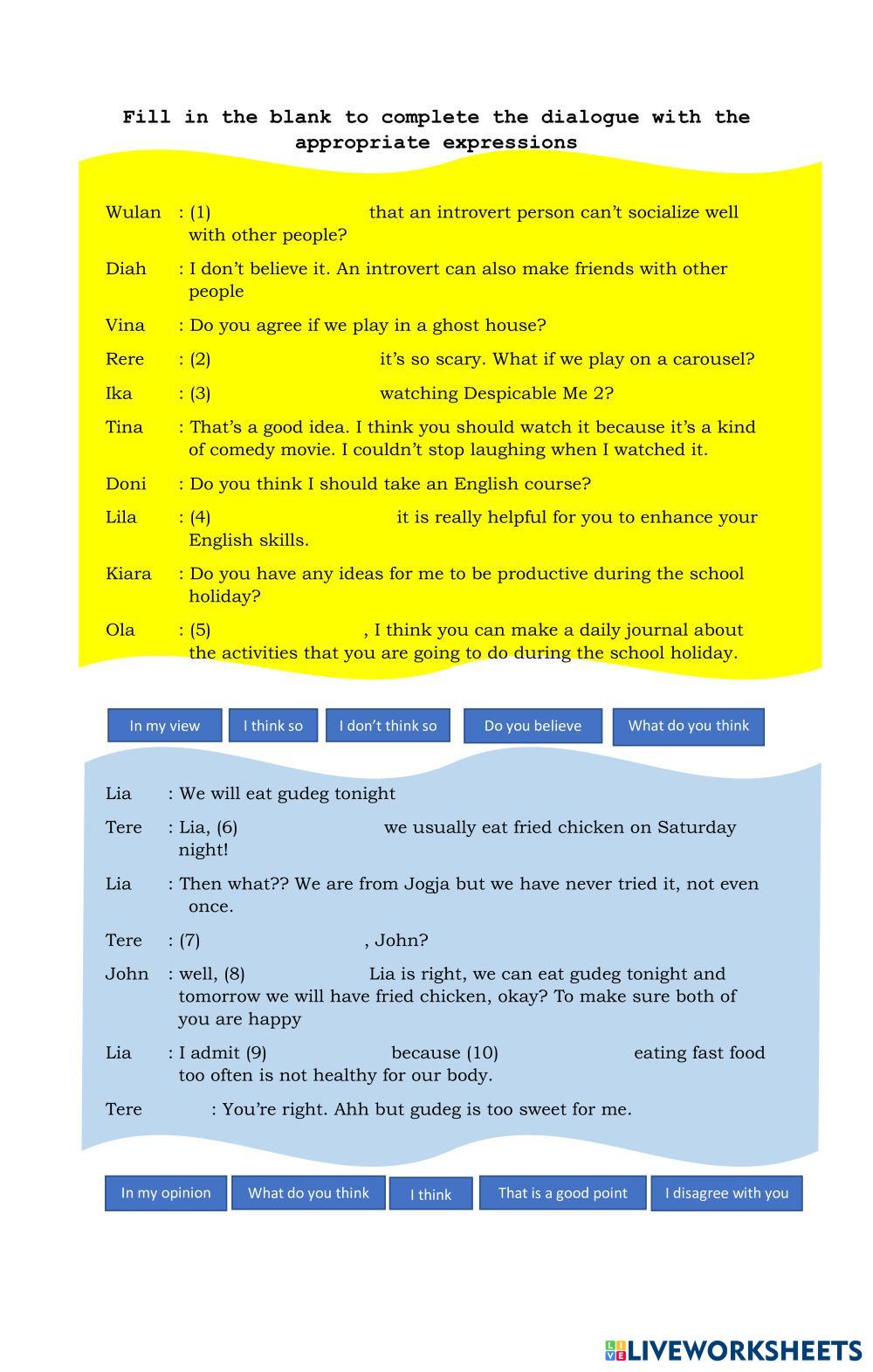 Created byDimas Kusuma English as a Second Language (ESL) Asking and giving opinion Age 14-18 level: 8 English คำแนะนำของผู้เขียน My Google Classroom Courses × 0 classes selected (0 students total) Quick Access Select all classes (0 classes) All Classes Loading courses... ยกเลิก Share Share to selected Course __COURSE_NAME__ __STUDENT_NAME__ (__STUDENT_EMAIL__) LKPD VISUAL ดาวน์โหลด Worksheet Validation Check my answers Emails my answers to my teacher ชื่อเต็ม Group/level School subject Teacher's email or key code Close ส่งข้อมูล Validating worksheet... (12) Your answers have been sent to your teacher. Good luck! OK We encountered an error submitting your answers. Please try again. OK โฆษณา | ใช้งานแบบไม่มีโฆษณา Created byDimas Kusuma English as a Second Language (ESL) Asking and giving opinion Age 14-18 level: 8 English คำแนะนำของผู้เขียน