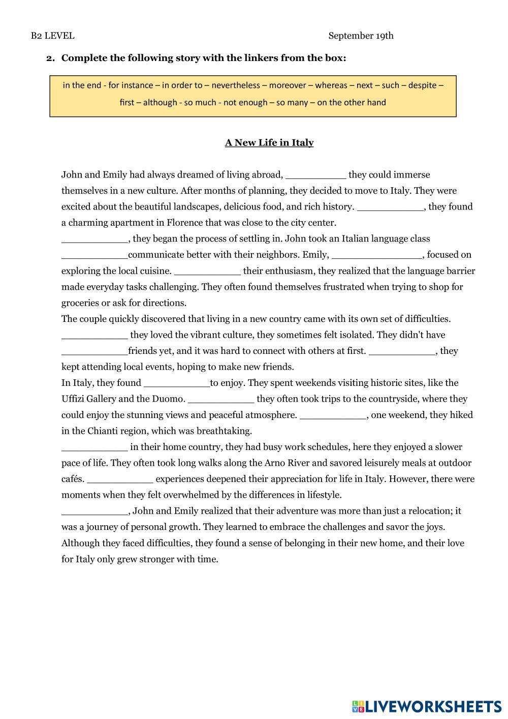 Created by Valeria04 English as a Second Language (ESL) Evaluation Age 18+ level: B2 English คำแนะนำของผู้เขียน My Google Classroom Courses × 0 classes selected (0 students total) Quick Access Select all classes (0 classes) All Classes Loading courses... ยกเลิก Share Share to selected Course __COURSE_NAME__ __STUDENT_NAME__ (__STUDENT_EMAIL__) Follow up conditionals and linking words ดาวน์โหลด Worksheet Validation Check my answers Emails my answers to my teacher ชื่อเต็ม Group/level School subject Teacher's email or key code Close ส่งข้อมูล Validating worksheet... (12) Your answers have been sent to your teacher. Good luck! OK We encountered an error submitting your answers. Please try again. OK โฆษณา | ใช้งานแบบไม่มีโฆษณา Created by Valeria04 English as a Second Language (ESL) Evaluation Age 18+ level: B2 English คำแนะนำของผู้เขียน