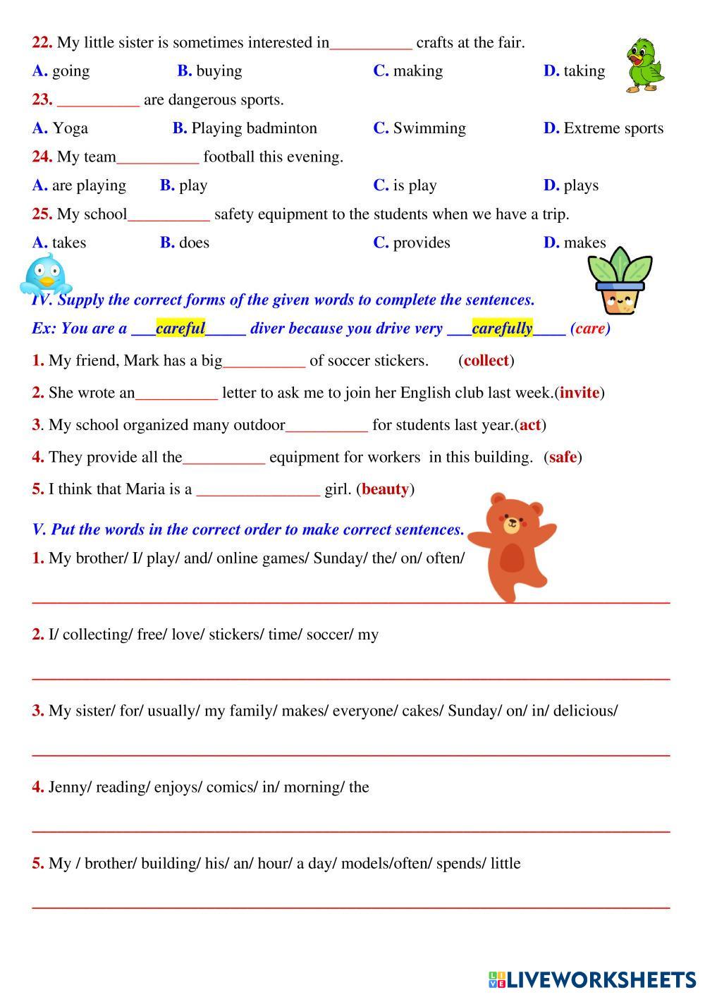Created byPhuong Chau English as a Second Language (ESL) Review Age 10+ level: grade 7 English คำแนะนำของผู้เขียน My Google Classroom Courses × 0 classes selected (0 students total) Quick Access Select all classes (0 classes) All Classes Loading courses... ยกเลิก Share Share to selected Course __COURSE_NAME__ __STUDENT_NAME__ (__STUDENT_EMAIL__) Review ดาวน์โหลด Worksheet Validation Check my answers Emails my answers to my teacher ชื่อเต็ม Group/level School subject Teacher's email or key code Close ส่งข้อมูล Validating worksheet... (12) Your answers have been sent to your teacher. Good luck! OK We encountered an error submitting your answers. Please try again. OK โฆษณา | ใช้งานแบบไม่มีโฆษณา Created byPhuong Chau English as a Second Language (ESL) Review Age 10+ level: grade 7 English คำแนะนำของผู้เขียน