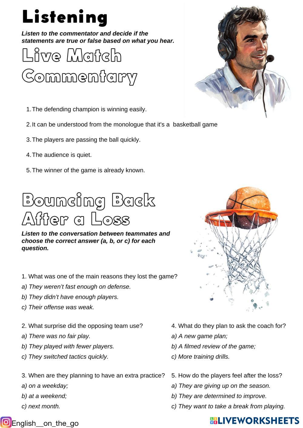 Created by life_line English as a Second Language (ESL) Listening comprehension Age 12+ level: intermediate English คำแนะนำของผู้เขียน My Google Classroom Courses × 0 classes selected (0 students total) Quick Access Select all classes (0 classes) All Classes Loading courses... ยกเลิก Share Share to selected Course __COURSE_NAME__ __STUDENT_NAME__ (__STUDENT_EMAIL__) Live Match Commentary ดาวน์โหลด Worksheet Validation Check my answers Emails my answers to my teacher ชื่อเต็ม Group/level School subject Teacher's email or key code Close ส่งข้อมูล Validating worksheet... (12) Your answers have been sent to your teacher. Good luck! OK We encountered an error submitting your answers. Please try again. OK โฆษณา | ใช้งานแบบไม่มีโฆษณา Created by life_line English as a Second Language (ESL) Listening comprehension Age 12+ level: intermediate English คำแนะนำของผู้เขียน