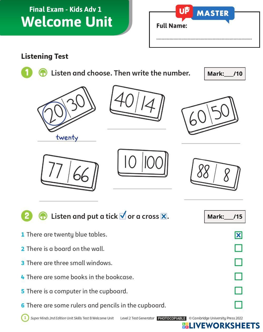 Created by UPMASTER_ONLINE_08 English as a Second Language (ESL) Final exam test Age 7-13 level: KIDS ADV 1 English คำแนะนำของผู้เขียน My Google Classroom Courses × 0 classes selected (0 students total) Quick Access Select all classes (0 classes) All Classes Loading courses... ยกเลิก Share Share to selected Course __COURSE_NAME__ __STUDENT_NAME__ (__STUDENT_EMAIL__) FINAL EXAM - KIDS ADV 1 ดาวน์โหลด Worksheet Validation Check my answers Emails my answers to my teacher ชื่อเต็ม Group/level School subject Teacher's email or key code Close ส่งข้อมูล Validating worksheet... (12) Your answers have been sent to your teacher. Good luck! OK We encountered an error submitting your answers. Please try again. OK โฆษณา | ใช้งานแบบไม่มีโฆษณา Created by UPMASTER_ONLINE_08 English as a Second Language (ESL) Final exam test Age 7-13 level: KIDS ADV 1 English คำแนะนำของผู้เขียน