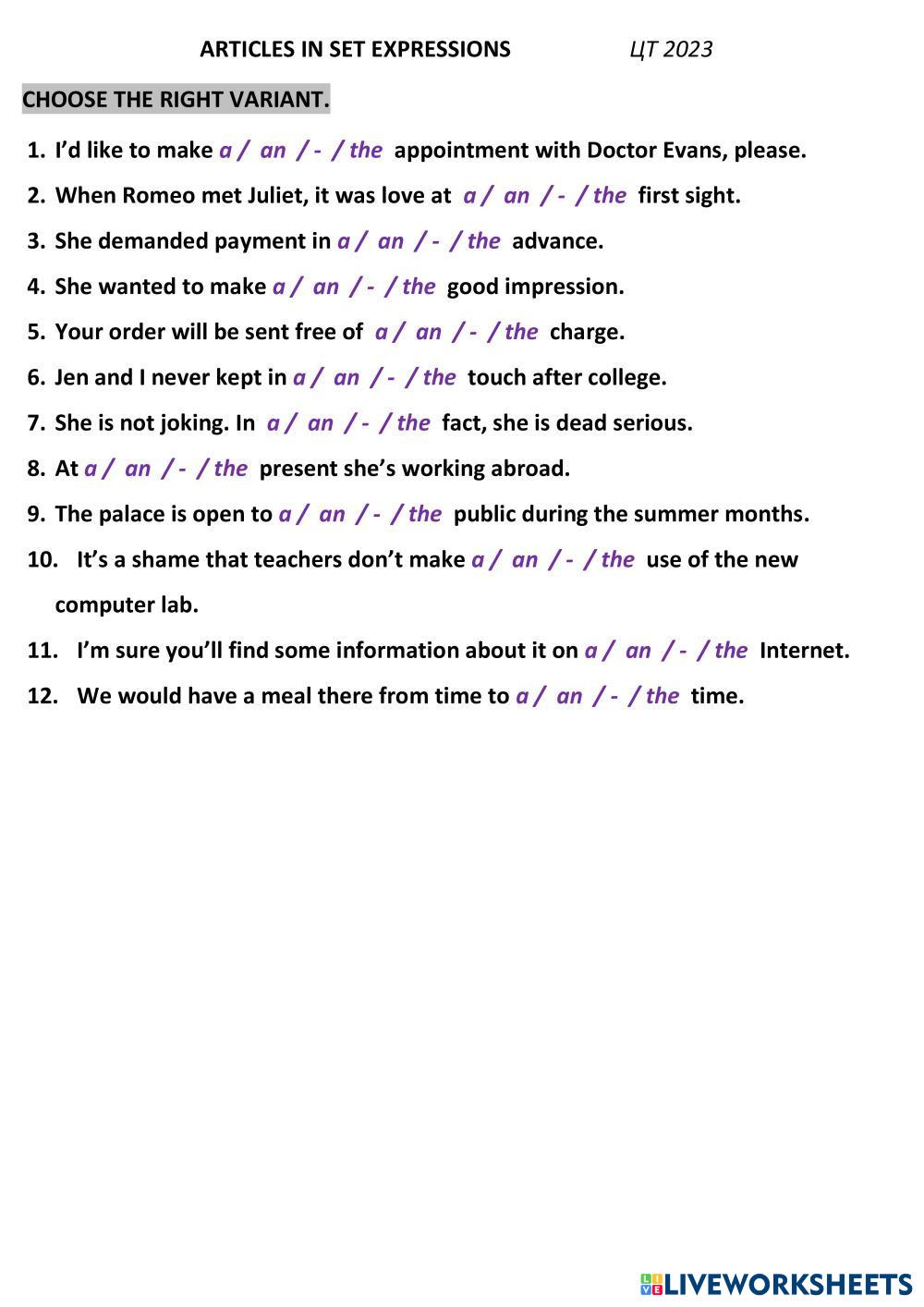Created by Mika_tima English as a Second Language (ESL) Articles Age 10+ level: 10 English คำแนะนำของผู้เขียน My Google Classroom Courses × 0 classes selected (0 students total) Quick Access Select all classes (0 classes) All Classes Loading courses... ยกเลิก Share Share to selected Course __COURSE_NAME__ __STUDENT_NAME__ (__STUDENT_EMAIL__) ARTICLES ЦТ 2023 ดาวน์โหลด Worksheet Validation Check my answers Emails my answers to my teacher ชื่อเต็ม Group/level School subject Teacher's email or key code Close ส่งข้อมูล Validating worksheet... (12) Your answers have been sent to your teacher. Good luck! OK We encountered an error submitting your answers. Please try again. OK โฆษณา | ใช้งานแบบไม่มีโฆษณา Created by Mika_tima English as a Second Language (ESL) Articles Age 10+ level: 10 English คำแนะนำของผู้เขียน