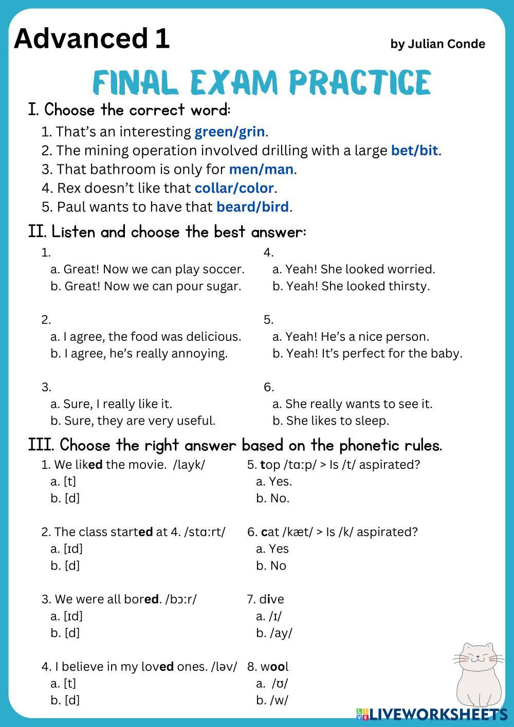 Created byJulián Ysaias Conde Borjas English as a Second Language (ESL) Pronunciation Age 3+ level: Basic English คำแนะนำของผู้เขียน My Google Classroom Courses × 0 classes selected (0 students total) Quick Access Select all classes (0 classes) All Classes Loading courses... ยกเลิก Share Share to selected Course __COURSE_NAME__ __STUDENT_NAME__ (__STUDENT_EMAIL__) Final Exam Practice ดาวน์โหลด Worksheet Validation Check my answers Emails my answers to my teacher ชื่อเต็ม Group/level School subject Teacher's email or key code Close ส่งข้อมูล Validating worksheet... (12) Your answers have been sent to your teacher. Good luck! OK We encountered an error submitting your answers. Please try again. OK โฆษณา | ใช้งานแบบไม่มีโฆษณา Created byJulián Ysaias Conde Borjas English as a Second Language (ESL) Pronunciation Age 3+ level: Basic English คำแนะนำของผู้เขียน
