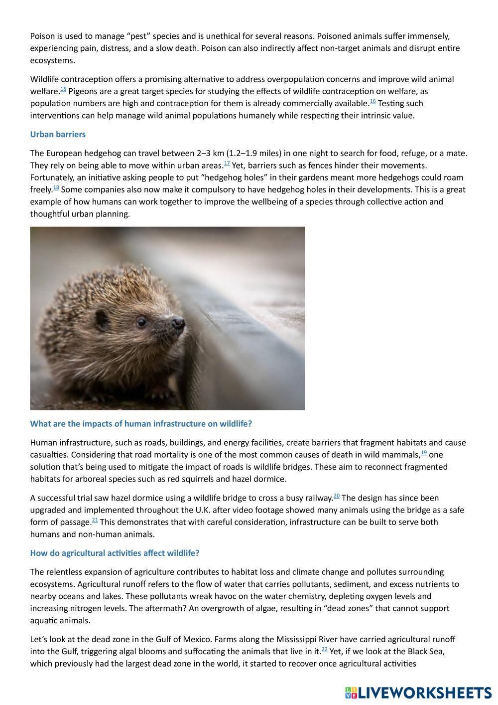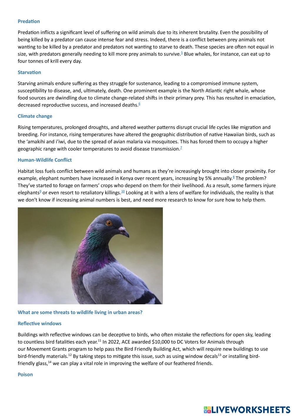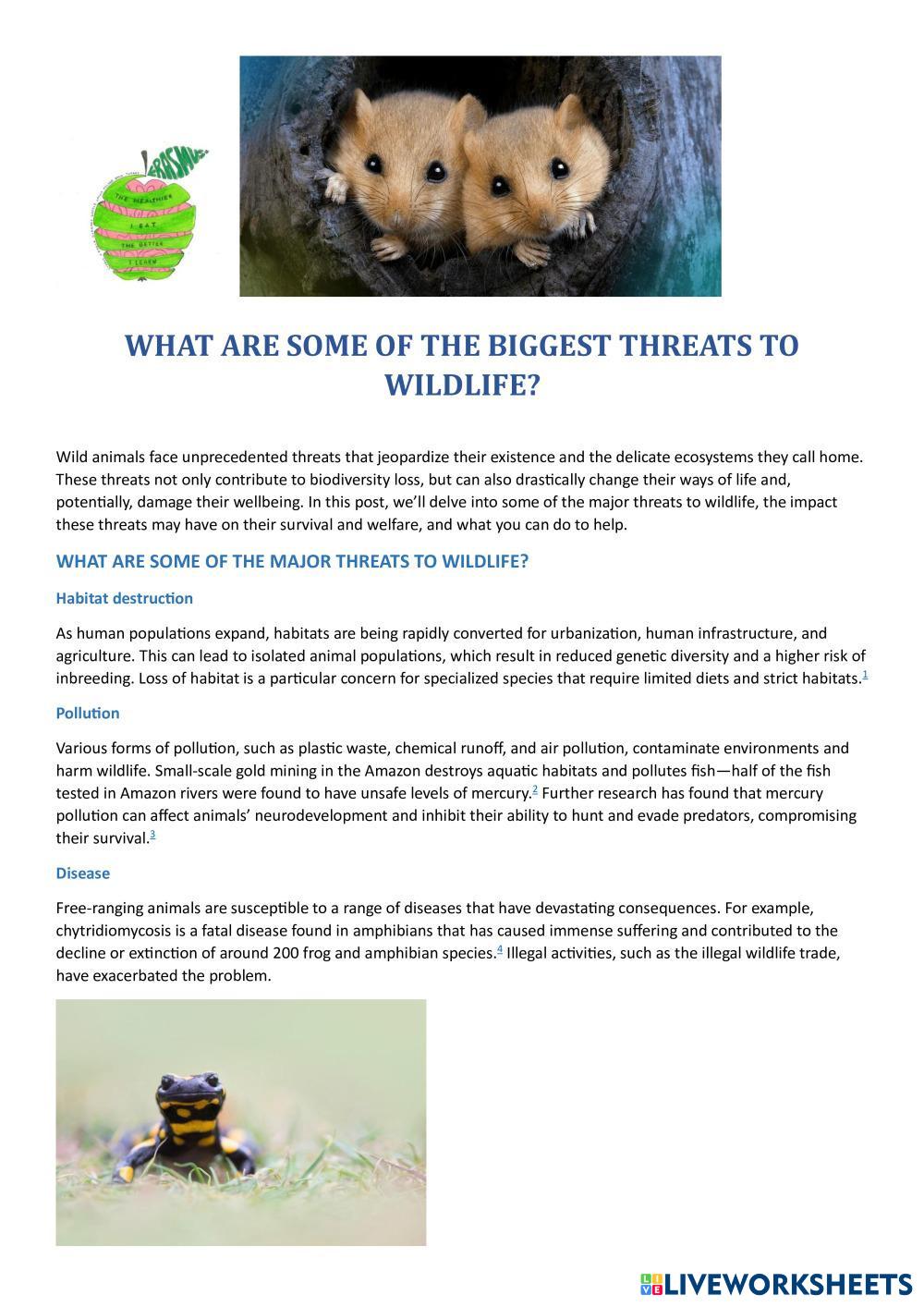 Created byKristīne English as a Second Language (ESL) Reading comprehension Age 13+ level: Intermediate English คำแนะนำของผู้เขียน My Google Classroom Courses × 0 classes selected (0 students total) Quick Access Select all classes (0 classes) All Classes Loading courses... ยกเลิก Share Share to selected Course __COURSE_NAME__ __STUDENT_NAME__ (__STUDENT_EMAIL__) Article_What are some of the biggest threats to the wildlfe? ดาวน์โหลด Worksheet Validation Check my answers Emails my answers to my teacher ชื่อเต็ม Group/level School subject Teacher's email or key code Close ส่งข้อมูล Validating worksheet... (12) Your answers have been sent to your teacher. Good luck! OK We encountered an error submitting your answers. Please try again. OK โฆษณา | ใช้งานแบบไม่มีโฆษณา Created byKristīne English as a Second Language (ESL) Reading comprehension Age 13+ level: Intermediate English คำแนะนำของผู้เขียน