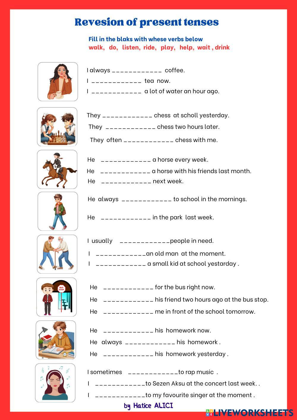 Created byHatice Alici English as a Second Language (ESL) Revesion of present tenses. Age 10+ level: A2 English คำแนะนำของผู้เขียน revesion of present tenses. My Google Classroom Courses × 0 classes selected (0 students total) Quick Access Select all classes (0 classes) All Classes Loading courses... ยกเลิก Share Share to selected Course __COURSE_NAME__ __STUDENT_NAME__ (__STUDENT_EMAIL__) Revesion of present tenses. ดาวน์โหลด Worksheet Validation Check my answers Emails my answers to my teacher ชื่อเต็ม Group/level School subject Teacher's email or key code Close ส่งข้อมูล Validating worksheet... (12) Your answers have been sent to your teacher. Good luck! OK We encountered an error submitting your answers. Please try again. OK โฆษณา | ใช้งานแบบไม่มีโฆษณา Created byHatice Alici English as a Second Language (ESL) Revesion of present tenses. Age 10+ level: A2 English คำแนะนำของผู้เขียน revesion of present tenses.