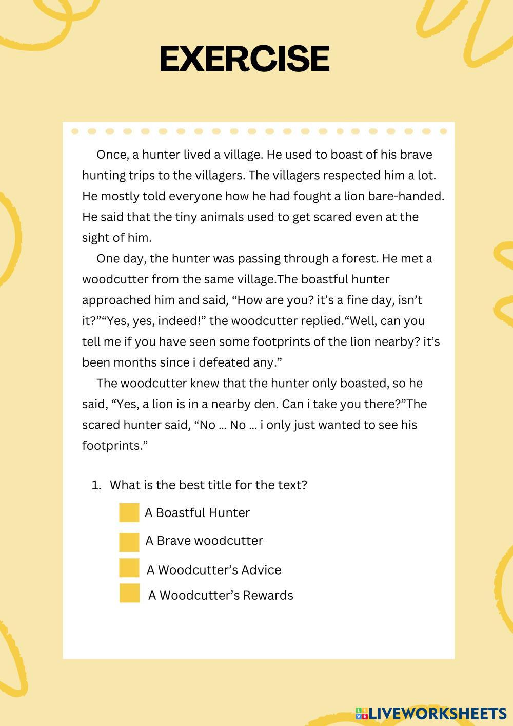 Created byNunung Setiani English Reading Age 16+ level: 10 English คำแนะนำของผู้เขียน - My Google Classroom Courses × 0 classes selected (0 students total) Quick Access Select all classes (0 classes) All Classes Loading courses... ยกเลิก Share Share to selected Course __COURSE_NAME__ __STUDENT_NAME__ (__STUDENT_EMAIL__) Narrative text ดาวน์โหลด Worksheet Validation Check my answers Emails my answers to my teacher ชื่อเต็ม Group/level School subject Teacher's email or key code Close ส่งข้อมูล Validating worksheet... (12) Your answers have been sent to your teacher. Good luck! OK We encountered an error submitting your answers. Please try again. OK โฆษณา | ใช้งานแบบไม่มีโฆษณา Created byNunung Setiani English Reading Age 16+ level: 10 English คำแนะนำของผู้เขียน -