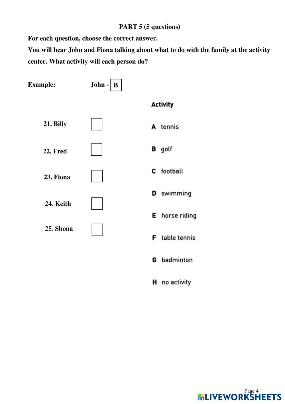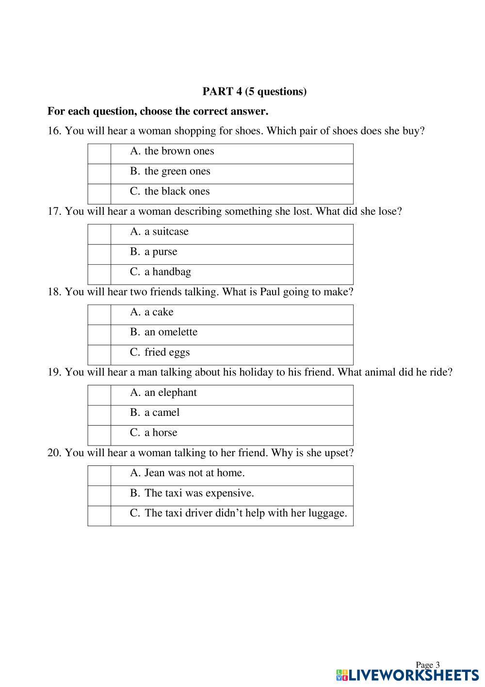 Created byEnglish English KET listening test Age 6-15 level: Pre-A1 English คำแนะนำของผู้เขียน My Google Classroom Courses × 0 classes selected (0 students total) Quick Access Select all classes (0 classes) All Classes Loading courses... ยกเลิก Share Share to selected Course __COURSE_NAME__ __STUDENT_NAME__ (__STUDENT_EMAIL__) KET LISTENING TEST 15 ดาวน์โหลด Worksheet Validation Check my answers Emails my answers to my teacher ชื่อเต็ม Group/level School subject Teacher's email or key code Close ส่งข้อมูล Validating worksheet... (12) Your answers have been sent to your teacher. Good luck! OK We encountered an error submitting your answers. Please try again. OK โฆษณา | ใช้งานแบบไม่มีโฆษณา Created byEnglish English KET listening test Age 6-15 level: Pre-A1 English คำแนะนำของผู้เขียน