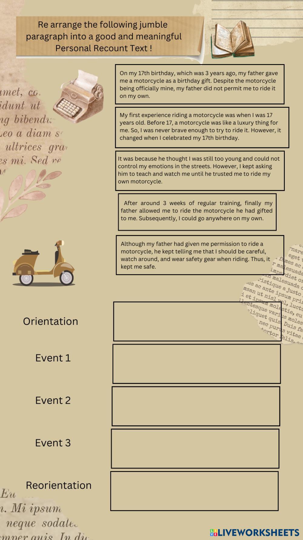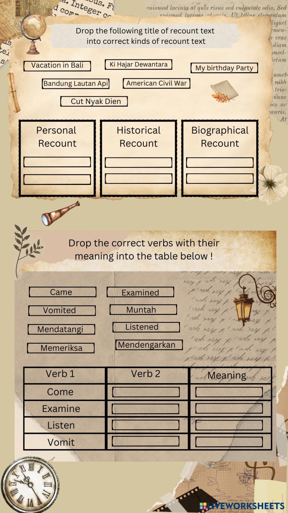 Created byFitria English Recount Age 14+ level: Senior High School English คำแนะนำของผู้เขียน My Google Classroom Courses × 0 classes selected (0 students total) Quick Access Select all classes (0 classes) All Classes Loading courses... ยกเลิก Share Share to selected Course __COURSE_NAME__ __STUDENT_NAME__ (__STUDENT_EMAIL__) Recount Text 10Grade ดาวน์โหลด Worksheet Validation Check my answers Emails my answers to my teacher ชื่อเต็ม Group/level School subject Teacher's email or key code Close ส่งข้อมูล Validating worksheet... (12) Your answers have been sent to your teacher. Good luck! OK We encountered an error submitting your answers. Please try again. OK โฆษณา | ใช้งานแบบไม่มีโฆษณา Created byFitria English Recount Age 14+ level: Senior High School English คำแนะนำของผู้เขียน