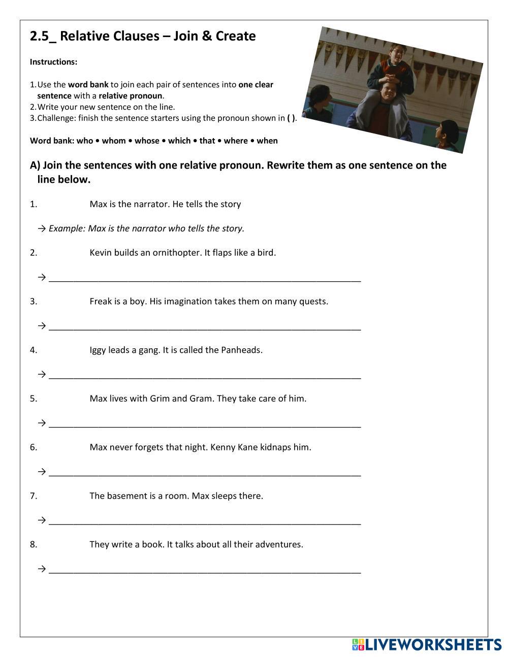 1. Use the word bank to join each pair of sentences into one clear sentence with a relative pronoun.