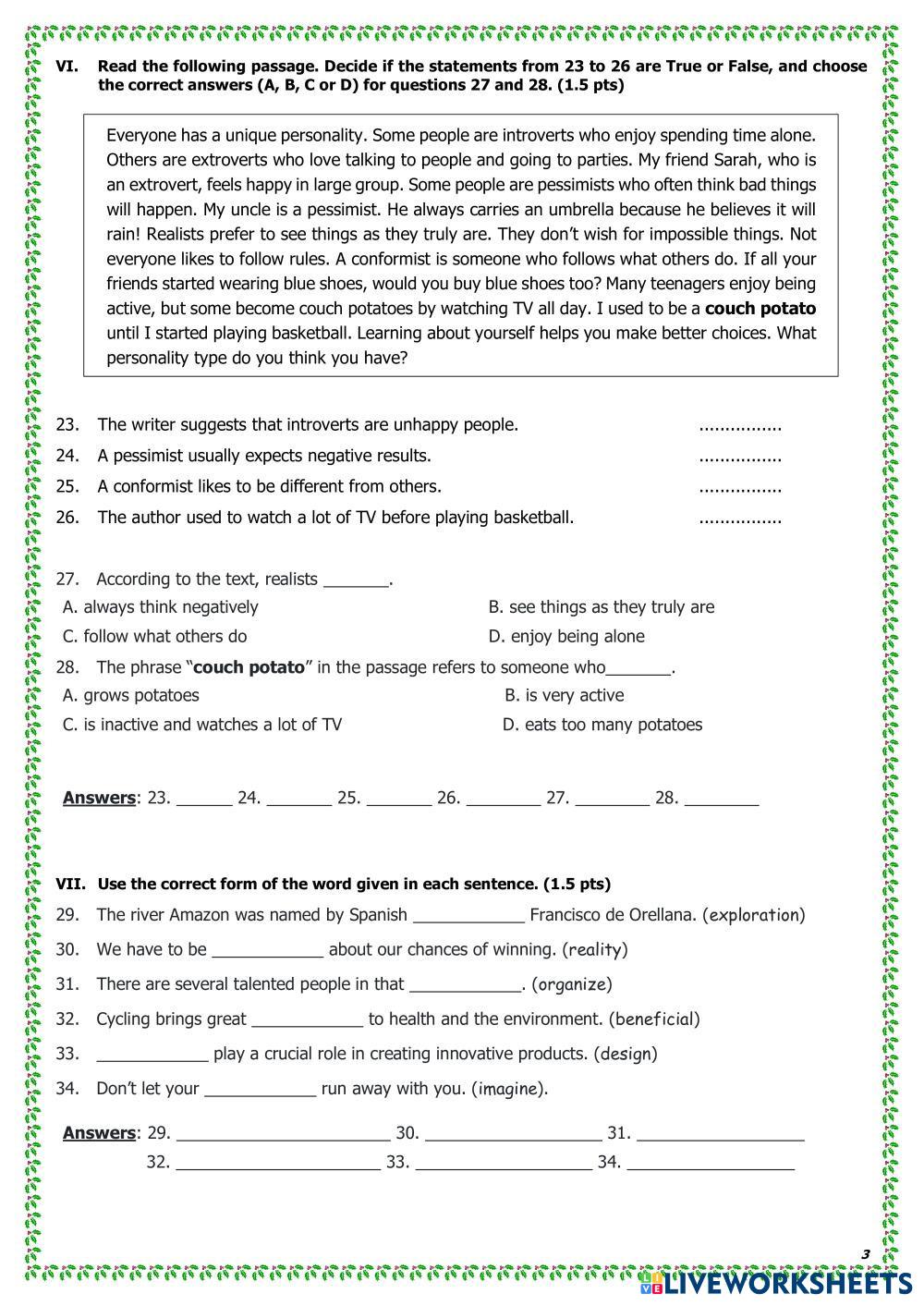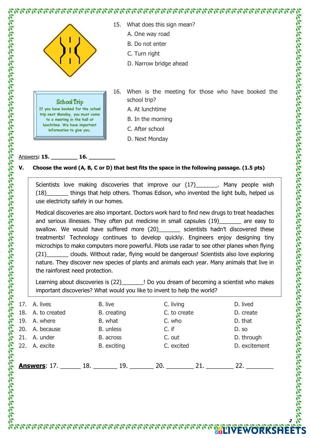 Created byNguyễn Thuý Liên ESL English B1 (ระดับกลางต่ำ) ไวยากรณ์ English คำแนะนำของผู้เขียน .. My Google Classroom Courses × 0 classes selected (0 students total) Quick Access Select all classes (0 classes) All Classes Loading courses... ยกเลิก Share Share to selected Course __COURSE_NAME__ __STUDENT_NAME__ (__STUDENT_EMAIL__) E9-MIDTERM 2-LTV-24-25 ดาวน์โหลด Worksheet Validation Check my answers Emails my answers to my teacher ชื่อเต็ม Group/level School subject Teacher's email or key code Close ส่งข้อมูล Validating worksheet... (12) Your answers have been sent to your teacher. Good luck! OK We encountered an error submitting your answers. Please try again. OK โฆษณา | ใช้งานแบบไม่มีโฆษณา Created byNguyễn Thuý Liên ESL English B1 (ระดับกลางต่ำ) ไวยากรณ์ English คำแนะนำของผู้เขียน .. สำรวจแผ่นงาน Past Simple vs Present Perfect ESL B1 Past Simple vs Present Perfect Grammar - ESL English as a second language by anmafan Main content: Present perfect or past simple Present Perfect Simple - positive and negative ESL B1 Present Perfect Simple - positive and negative Grammar - ESL English as a second language Worksheet on present perfect simple Main content: Present perfect Other contents: present perfect simple, form, positive, negative Present Simple Tense ESL B1 Present Simple Tense Grammar - ESL Write the correct answer. English as a Second Language Main content: Present Simple Other contents: Subject verb agreement Simple Past Tense ESL B1 Simple Past Tense Grammar - ESL English as a second language Simple past tense Main content: Past simple Other contents: Regular and Irregular Verbs