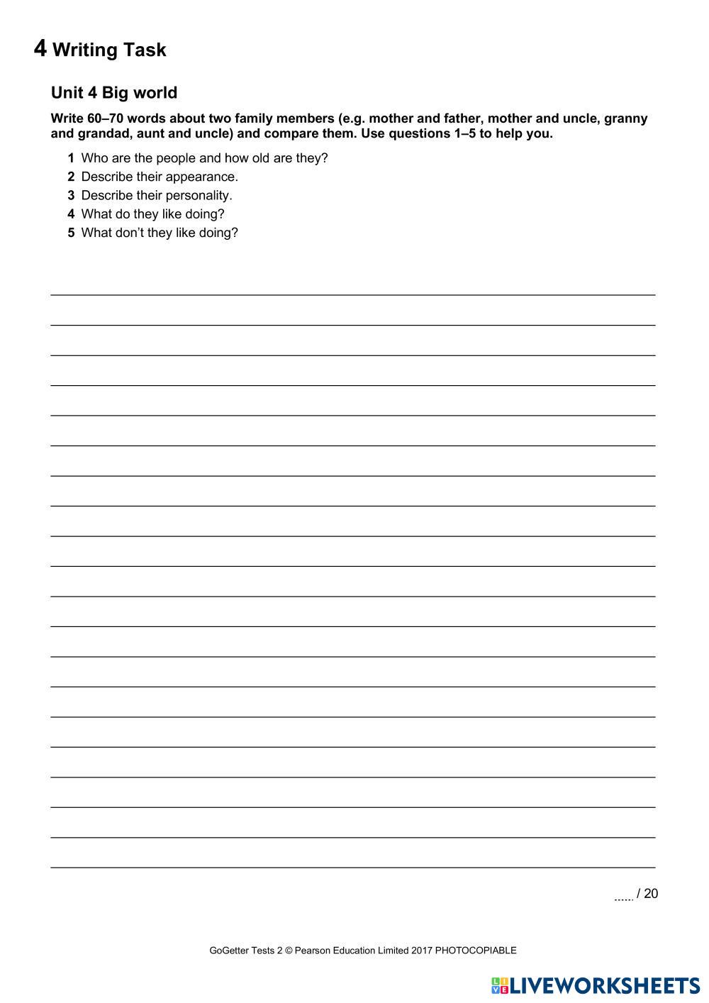 Created by Gondyuk ESL English A2 (พื้นฐาน) ไวยากรณ์ English คำแนะนำของผู้เขียน Be attentive and do the tasks. My Google Classroom Courses × 0 classes selected (0 students total) Quick Access Select all classes (0 classes) All Classes Loading courses... ยกเลิก Share Share to selected Course __COURSE_NAME__ __STUDENT_NAME__ (__STUDENT_EMAIL__) Go Getter 2 Test 4 ดาวน์โหลด Worksheet Validation Check my answers Emails my answers to my teacher ชื่อเต็ม Group/level School subject Teacher's email or key code Close ส่งข้อมูล Validating worksheet... (12) Your answers have been sent to your teacher. Good luck! OK We encountered an error submitting your answers. Please try again. OK โฆษณา | ใช้งานแบบไม่มีโฆษณา Created by Gondyuk ESL English A2 (พื้นฐาน) ไวยากรณ์ English คำแนะนำของผู้เขียน Be attentive and do the tasks. สำรวจแผ่นงาน Past Simple - Regular and irregular verbs ESL A2 Past Simple - Regular and irregular verbs Grammar - ESL English as a second language Past simple - regular and irregular verbs. Affirmative and negative sentences, questions. FIRST CONDITIONAL ESL A2 FIRST CONDITIONAL Grammar - ESL Answer the questions Richmond Go Unit 4 Did ESL A2 Richmond Go Unit 4 Did Grammar - ESL Look and complete with Past Simple. Present simple affirmative and negative ESL A2 Present simple affirmative and negative Grammar - ESL English as a second language This worksheet is not my product, I've just made it interactive. Main content: Present Simple