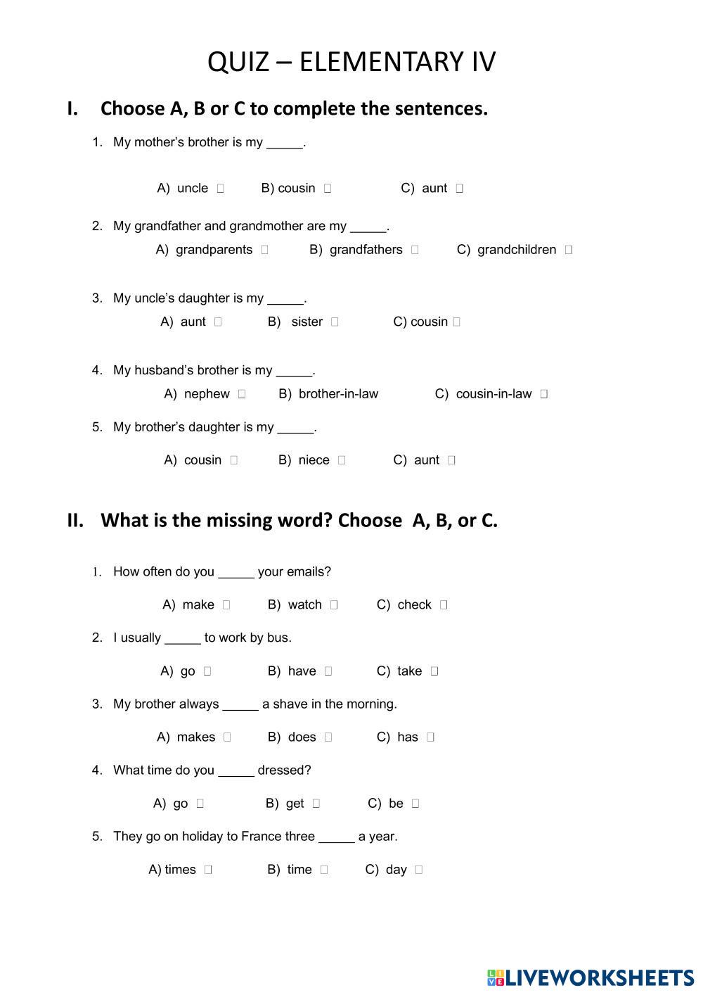 Created byINGRID MENDOZA ESL English, British A1 (เริ่มต้น) ไวยากรณ์ English คำแนะนำของผู้เขียน DEVELOP GRAMMAR AD VOCABULARY My Google Classroom Courses × 0 classes selected (0 students total) Quick Access Select all classes (0 classes) All Classes Loading courses... ยกเลิก Share Share to selected Course __COURSE_NAME__ __STUDENT_NAME__ (__STUDENT_EMAIL__) QUIZ ELEMENTARY IV ดาวน์โหลด Worksheet Validation Check my answers Emails my answers to my teacher ชื่อเต็ม Group/level School subject Teacher's email or key code Close ส่งข้อมูล Validating worksheet... (12) Your answers have been sent to your teacher. Good luck! OK We encountered an error submitting your answers. Please try again. OK โฆษณา | ใช้งานแบบไม่มีโฆษณา Created byINGRID MENDOZA ESL English, British A1 (เริ่มต้น) ไวยากรณ์ English คำแนะนำของผู้เขียน DEVELOP GRAMMAR AD VOCABULARY สำรวจแผ่นงาน 3º Unit 4 Repàs ESL A1 3º Unit 4 Repàs Grammar - ESL Repàs per als alumnes de 3er FINAL ELEMENTARY IV ESL A1 FINAL ELEMENTARY IV Grammar - ESL DEVELOP FOUR SKILLS FINAL ELEMENTARY IV ESL A1 FINAL ELEMENTARY IV Grammar - ESL DEVELOP FOUR SKILLS PRESENT CONTINUOUS PRACTICE ESL A1 PRESENT CONTINUOUS PRACTICE Grammar - ESL Present continuous practice