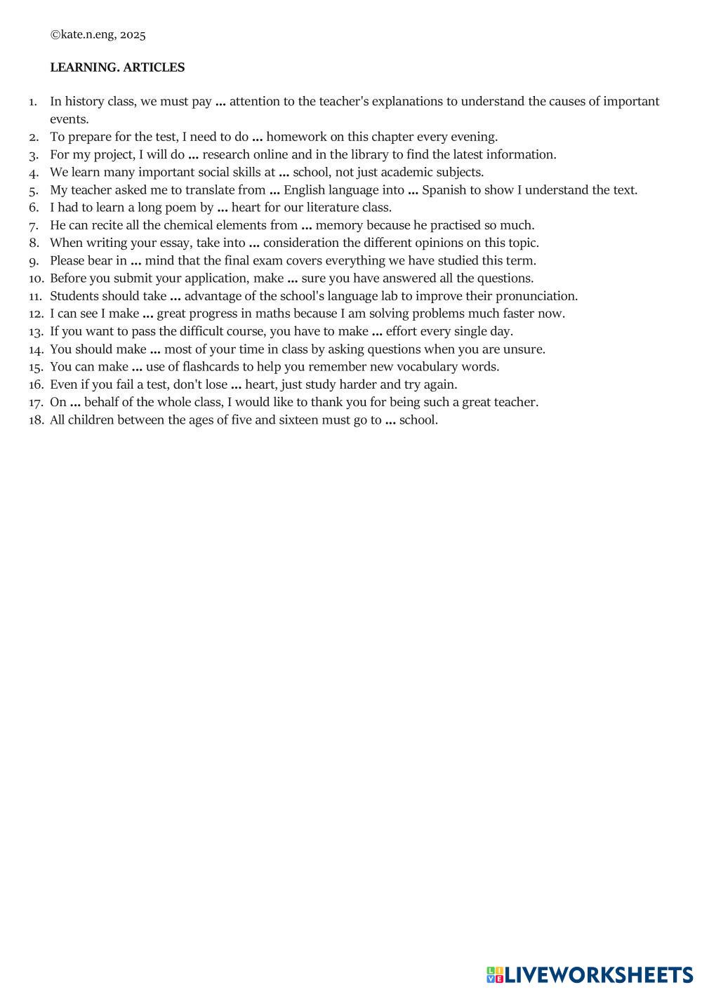 Created byТатьяна Камчиц ESL English B1 (ระดับกลางต่ำ) ไวยากรณ์ English คำแนะนำของผู้เขียน X/ a/ an/ the My Google Classroom Courses × 0 classes selected (0 students total) Quick Access Select all classes (0 classes) All Classes Loading courses... ยกเลิก Share Share to selected Course __COURSE_NAME__ __STUDENT_NAME__ (__STUDENT_EMAIL__) Learning. Articles ดาวน์โหลด Worksheet Validation Check my answers Emails my answers to my teacher ชื่อเต็ม Group/level School subject Teacher's email or key code Close ส่งข้อมูล Validating worksheet... (12) Your answers have been sent to your teacher. Good luck! OK We encountered an error submitting your answers. Please try again. OK โฆษณา | ใช้งานแบบไม่มีโฆษณา Created byТатьяна Камчиц ESL English B1 (ระดับกลางต่ำ) ไวยากรณ์ English คำแนะนำของผู้เขียน X/ a/ an/ the สำรวจแผ่นงาน PASSIVE & CAUSATIVE: same action, different story (B1) ESL B1 PASSIVE & CAUSATIVE: same action, different story (B1) Grammar - ESL Complete the following tasks. Past Simple vs Present Perfect ESL B1 Past Simple vs Present Perfect Grammar - ESL English as a second language by anmafan Main content: Present perfect or past simple DIY: modal verbs revision ESL B1 DIY: modal verbs revision Grammar - ESL - Grammar test Modal verbs (may, might, could, should, have to, must) ESL B1 Grammar test Modal verbs (may, might, could, should, have to, must) Grammar - ESL Read and choose the option