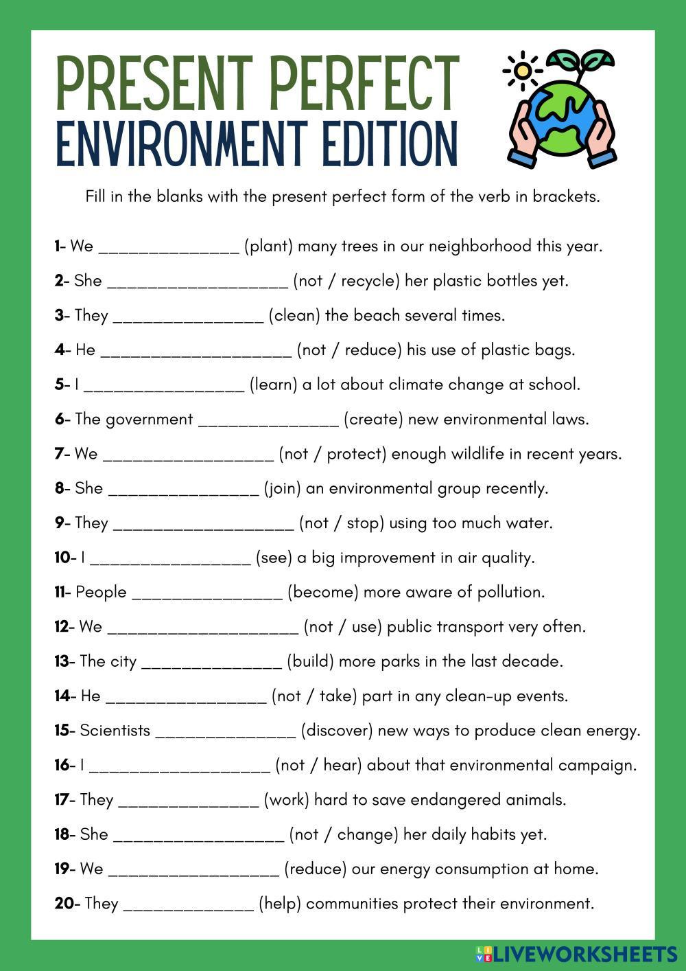 This B1-level ESL worksheet helps your students practice their knowledge of the Present Perfect while learning English vocabulary about the environment.