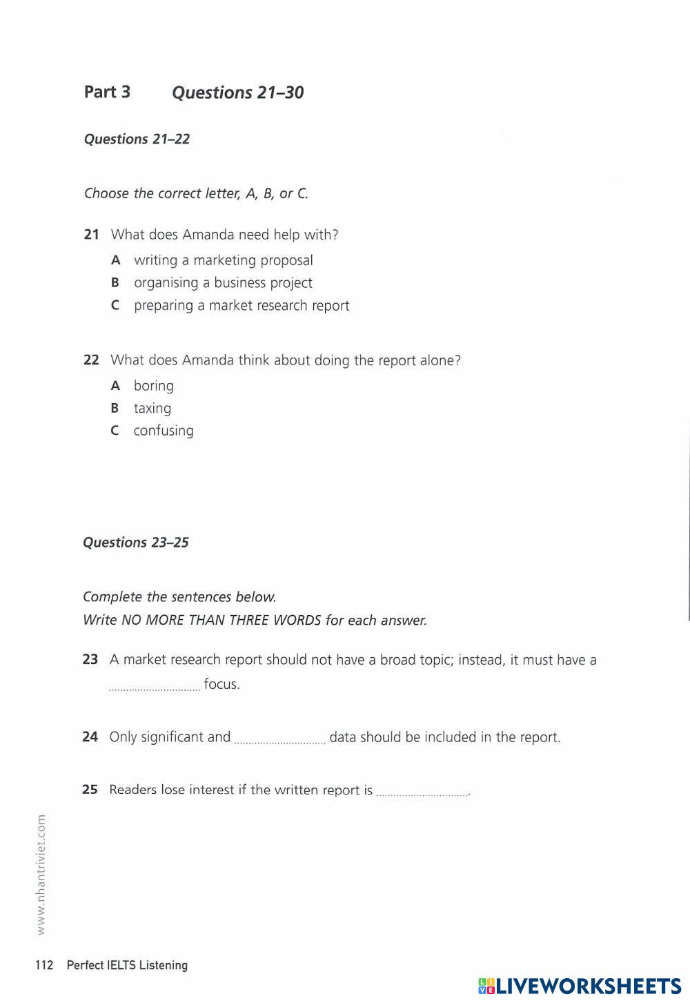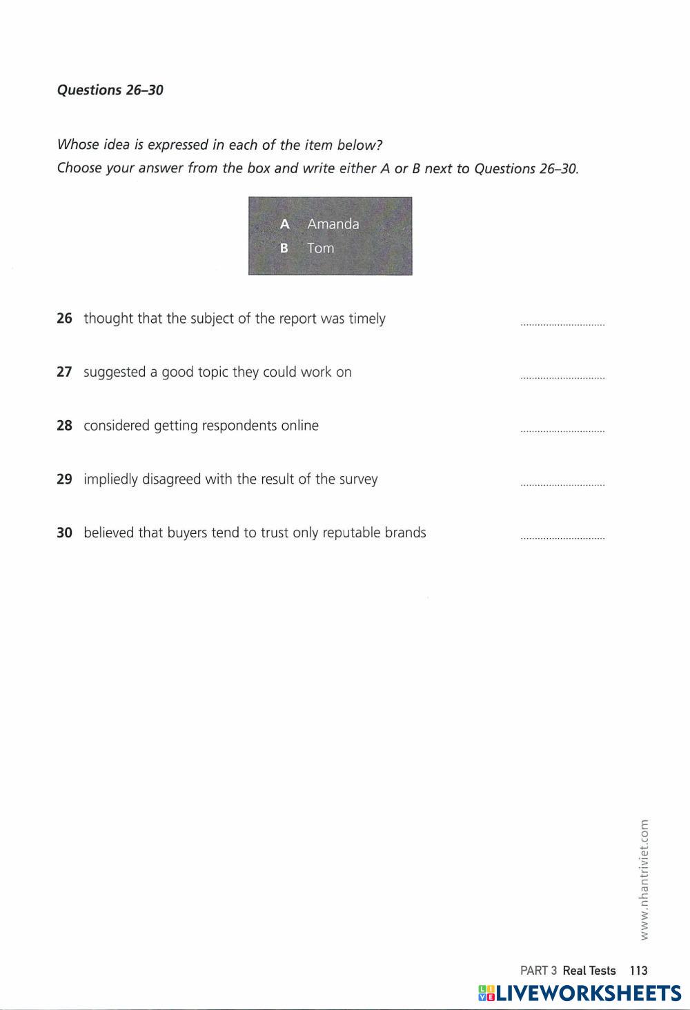 Created byNguyễn Thuý Liên ESL C1 (ขั้นสูง) ไวยากรณ์ English คำแนะนำของผู้เขียน . My Google Classroom Courses × 0 classes selected (0 students total) Quick Access Select all classes (0 classes) All Classes Loading courses... ยกเลิก Share Share to selected Course __COURSE_NAME__ __STUDENT_NAME__ (__STUDENT_EMAIL__) Perfect ielts listening - Test 1 ดาวน์โหลด Worksheet Validation Check my answers Emails my answers to my teacher ชื่อเต็ม Group/level School subject Teacher's email or key code Close ส่งข้อมูล Validating worksheet... (12) Your answers have been sent to your teacher. Good luck! OK We encountered an error submitting your answers. Please try again. OK โฆษณา | ใช้งานแบบไม่มีโฆษณา Created byNguyễn Thuý Liên ESL C1 (ขั้นสูง) ไวยากรณ์ English คำแนะนำของผู้เขียน . สำรวจแผ่นงาน Perfect ielts listening - Test 2 ESL C1 Perfect ielts listening - Test 2 Grammar - ESL . أركان الجملة الفعلية ESL C1 أركان الجملة الفعلية Grammar - ESL اقرأ الأسئلو وأجيب عنها أركان الجملة الفعلية الفعل والفاعل والمفعول به رحلتي مع كلمة صمد ESL C1 رحلتي مع كلمة صمد Grammar - ESL قراءة السؤال أولا Indirect Speech (C1) ESL C1 Indirect Speech (C1) Grammar - ESL Rewrite the sentences using reported speech. Be careful with word order and reporting verbs.