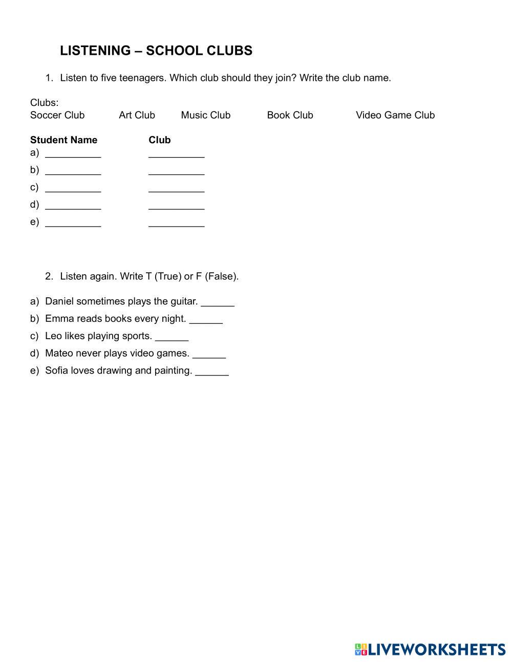 Match the teenager to the clubs