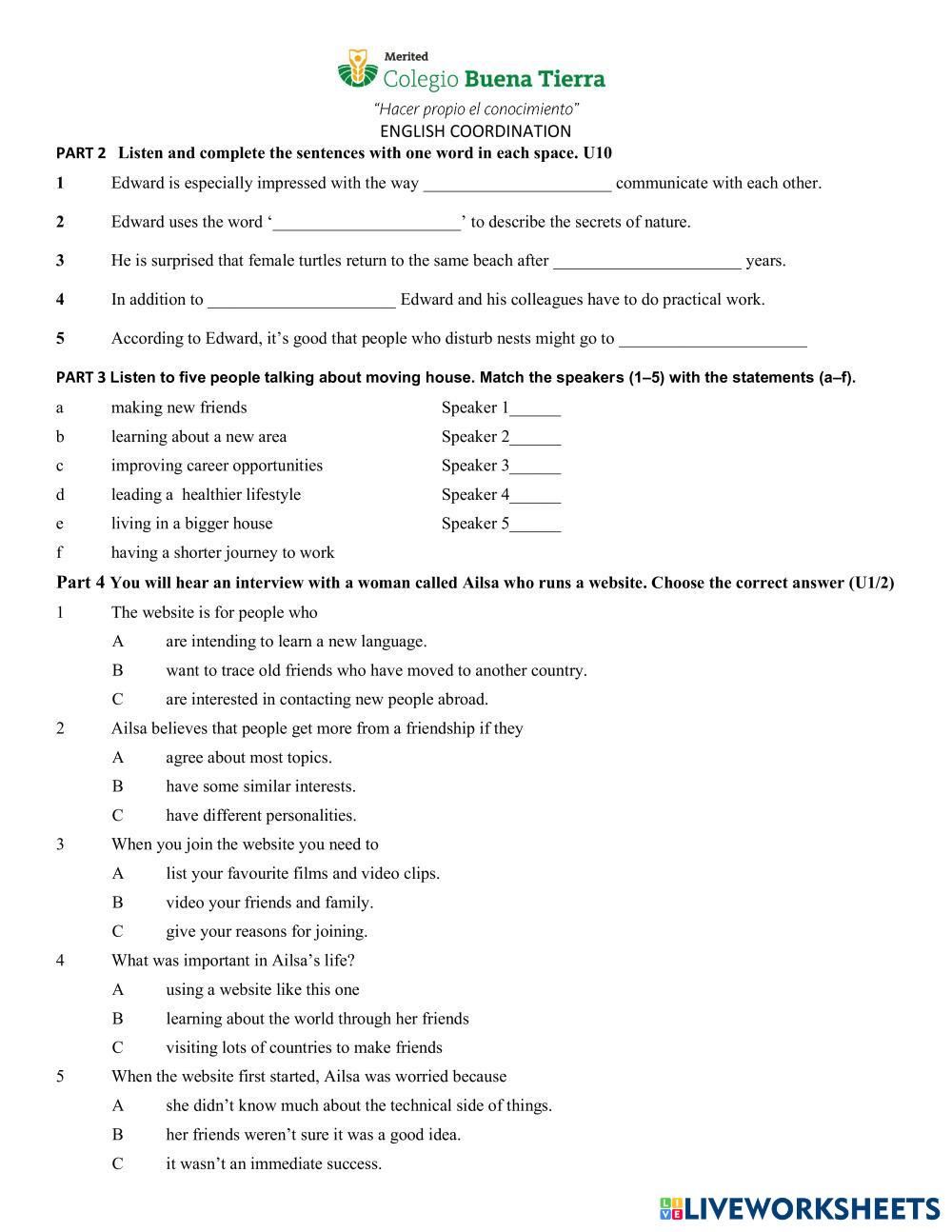 Created byJoanna Lazos ESL English B1 (ระดับกลางต่ำ) การฟัง English คำแนะนำของผู้เขียน Listen and solve. My Google Classroom Courses × 0 classes selected (0 students total) Quick Access Select all classes (0 classes) All Classes Loading courses... ยกเลิก Share Share to selected Course __COURSE_NAME__ __STUDENT_NAME__ (__STUDENT_EMAIL__) 4th Term Listening Exam ดาวน์โหลด Worksheet Validation Check my answers Emails my answers to my teacher ชื่อเต็ม Group/level School subject Teacher's email or key code Close ส่งข้อมูล Validating worksheet... (12) Your answers have been sent to your teacher. Good luck! OK We encountered an error submitting your answers. Please try again. OK โฆษณา | ใช้งานแบบไม่มีโฆษณา Created byJoanna Lazos ESL English B1 (ระดับกลางต่ำ) การฟัง English คำแนะนำของผู้เขียน Listen and solve. สำรวจแผ่นงาน Listening 19 ESL B1 Listening 19 Listening - ESL Take screenshots of your homework! Listening Ex. > Spelling Cities and Names ESL B1 Listening Ex. > Spelling Cities and Names Listening - ESL Listen and spell correctly the words you hear. Sunday Bloody Sunday B1 Listening Ireland St. Patrick's Day ESL B1 Sunday Bloody Sunday B1 Listening Ireland St. Patrick's Day Listening - ESL Listen and click the correct words. We are doing this as part of our Saint Patrick's Day activities Mini Listening Test ESL B1 Mini Listening Test Listening - ESL Choose the correct answer