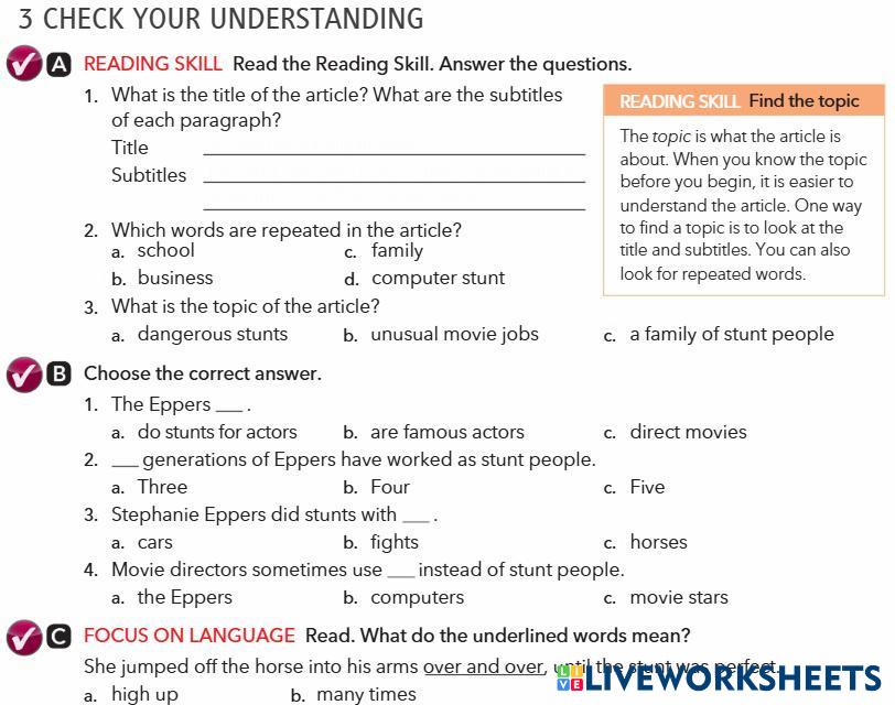 Created byIsaura Castro Zabala ESL English A2 (พื้นฐาน) การอ่าน English คำแนะนำของผู้เขียน CHECK YOUR UNDERSTANDING My Google Classroom Courses × 0 classes selected (0 students total) Quick Access Select all classes (0 classes) All Classes Loading courses... ยกเลิก Share Share to selected Course __COURSE_NAME__ __STUDENT_NAME__ (__STUDENT_EMAIL__) AN UNUSUAL FAMILY BUSINESS (READING) ดาวน์โหลด Worksheet Validation Check my answers Emails my answers to my teacher ชื่อเต็ม Group/level School subject Teacher's email or key code Close ส่งข้อมูล Validating worksheet... (12) Your answers have been sent to your teacher. Good luck! OK We encountered an error submitting your answers. Please try again. OK โฆษณา | ใช้งานแบบไม่มีโฆษณา Created byIsaura Castro Zabala ESL English A2 (พื้นฐาน) การอ่าน English คำแนะนำของผู้เขียน CHECK YOUR UNDERSTANDING สำรวจแผ่นงาน Prepare 7 U15 L3 Reading ESL A2 Prepare 7 U15 L3 Reading Reading - ESL Read the blog and do the tasks. Wider world 2 (9.3) ESL A2 Wider world 2 (9.3) Reading - ESL Exploring nature Talking Sport A2 Reader Multiple Matching ESL A2 Talking Sport A2 Reader Multiple Matching Reading - ESL Read the three texts and match them with the questions below. Understanding Characters ESL A2 Understanding Characters Reading - ESL Understanding Characters