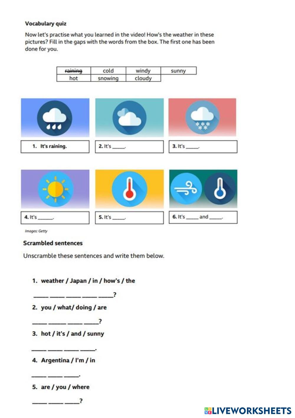 Created bySabrina Henriquez ESL English A2 (พื้นฐาน) คำศัพท์ English คำแนะนำของผู้เขียน Watch the video and complete the activities https://youtu.be/sMg4vj6ugSs My Google Classroom Courses × 0 classes selected (0 students total) Quick Access Select all classes (0 classes) All Classes Loading courses... ยกเลิก Share Share to selected Course __COURSE_NAME__ __STUDENT_NAME__ (__STUDENT_EMAIL__) How's the weather? - Worksheet ดาวน์โหลด Worksheet Validation Check my answers Emails my answers to my teacher ชื่อเต็ม Group/level School subject Teacher's email or key code Close ส่งข้อมูล Validating worksheet... (12) Your answers have been sent to your teacher. Good luck! OK We encountered an error submitting your answers. Please try again. OK โฆษณา | ใช้งานแบบไม่มีโฆษณา Created bySabrina Henriquez ESL English A2 (พื้นฐาน) คำศัพท์ English คำแนะนำของผู้เขียน Watch the video and complete the activities https://youtu.be/sMg4vj6ugSs สำรวจแผ่นงาน Homework 22 ESL A2 Homework 22 Vocabulary - ESL Suffix-tion Homework 21 ESL A2 Homework 21 Vocabulary - ESL Vocabulary How's the weather? - Worksheet ESL A2 How's the weather? - Worksheet Vocabulary - ESL Watch the video and complete the activities 4TH QUARTER SUMMATIVE TEST-CHRISTIAN LIVING 1 ESL A2 4TH QUARTER SUMMATIVE TEST-CHRISTIAN LIVING 1 Vocabulary - ESL Read each direction and question carefully before answering. Follow the instructions in every part of the worksheet. Make sure you have read and answered all the items. You are given only one chance to complete and submit your answers.