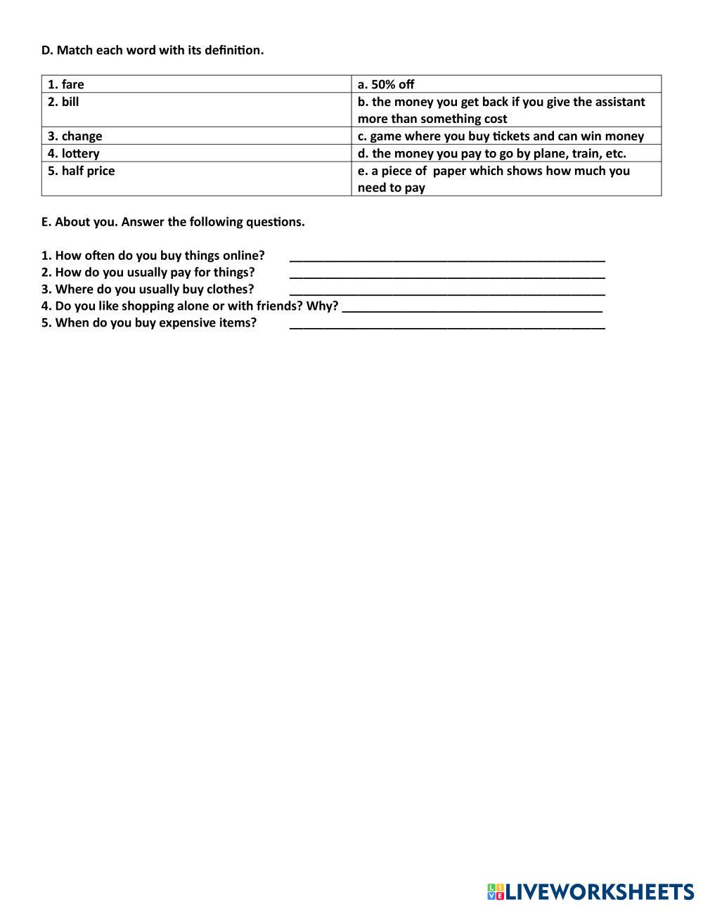 Created by deng19 ESL English A1 (เริ่มต้น) คำศัพท์ English คำแนะนำของผู้เขียน Complete the test. My Google Classroom Courses × 0 classes selected (0 students total) Quick Access Select all classes (0 classes) All Classes Loading courses... ยกเลิก Share Share to selected Course __COURSE_NAME__ __STUDENT_NAME__ (__STUDENT_EMAIL__) Unit Review ดาวน์โหลด Worksheet Validation Check my answers Emails my answers to my teacher ชื่อเต็ม Group/level School subject Teacher's email or key code Close ส่งข้อมูล Validating worksheet... (12) Your answers have been sent to your teacher. Good luck! OK We encountered an error submitting your answers. Please try again. OK โฆษณา | ใช้งานแบบไม่มีโฆษณา Created by deng19 ESL English A1 (เริ่มต้น) คำศัพท์ English คำแนะนำของผู้เขียน Complete the test. สำรวจแผ่นงาน ENGLISH HOMEWORK 1 ESL A1 ENGLISH HOMEWORK 1 Vocabulary - ESL Luego de haber visto los videos, completar las actividades en esta hoja de trabajo interactiva. Activities ESL A1 Activities Vocabulary - ESL Haz clic en los dibujos y aprende cómo se dice y se escribe. Numbers 1-20 ESL A1 Numbers 1-20 Vocabulary - ESL English as a second language Number the words under the pictures Main content: Numbers Daily Routines ESL A1 Daily Routines Vocabulary - ESL English as a second language For practicing simple present with daily routines. Main content: Daily Routines Other contents: Simple present