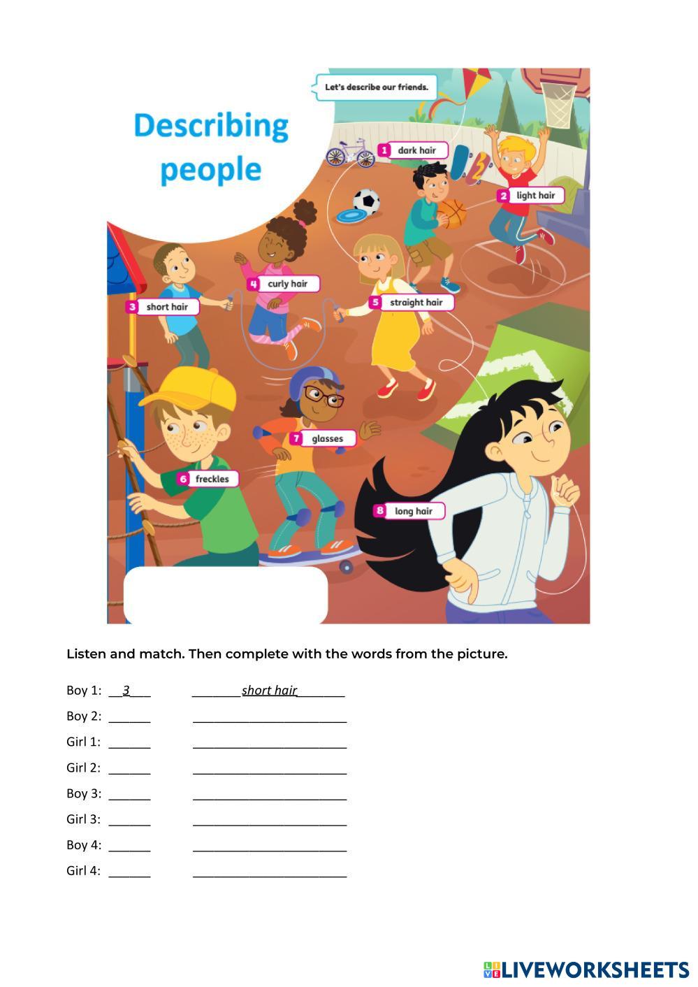 Created by paularoy ESL English A1 (เริ่มต้น) คำศัพท์ English คำแนะนำของผู้เขียน Look, listen and match. My Google Classroom Courses × 0 classes selected (0 students total) Quick Access Select all classes (0 classes) All Classes Loading courses... ยกเลิก Share Share to selected Course __COURSE_NAME__ __STUDENT_NAME__ (__STUDENT_EMAIL__) U1 - describing people 1 ดาวน์โหลด Worksheet Validation Check my answers Emails my answers to my teacher ชื่อเต็ม Group/level School subject Teacher's email or key code Close ส่งข้อมูล Validating worksheet... (12) Your answers have been sent to your teacher. Good luck! OK We encountered an error submitting your answers. Please try again. OK โฆษณา | ใช้งานแบบไม่มีโฆษณา Created by paularoy ESL English A1 (เริ่มต้น) คำศัพท์ English คำแนะนำของผู้เขียน Look, listen and match. สำรวจแผ่นงาน Numbers 1-20 ESL A1 Numbers 1-20 Vocabulary - ESL English as a second language Number the words under the pictures Main content: Numbers U1 - describing people 3 ESL A1 U1 - describing people 3 Vocabulary - ESL Look, read and select. MEALS OF THE DAY ESL A1 MEALS OF THE DAY Vocabulary - ESL Match the words (1–10) with the definitions (A–J): Daily Routines ESL A1 Daily Routines Vocabulary - ESL English as a second language For practicing simple present with daily routines. Main content: Daily Routines Other contents: Simple present