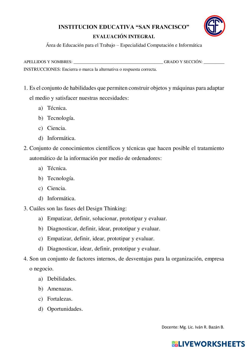 Created byIVAN RICARDO BAZAN BARCO Evaluación Evlauación Age 11+ level: SECUNDARIA English คำแนะนำของผู้เขียน My Google Classroom Courses × 0 classes selected (0 students total) Quick Access Select all classes (0 classes) All Classes Loading courses... ยกเลิก Share Share to selected Course __COURSE_NAME__ __STUDENT_NAME__ (__STUDENT_EMAIL__) Evaluación Integral EPT - CeI ดาวน์โหลด Worksheet Validation Check my answers Emails my answers to my teacher ชื่อเต็ม Group/level School subject Teacher's email or key code Close ส่งข้อมูล Validating worksheet... (12) Your answers have been sent to your teacher. Good luck! OK We encountered an error submitting your answers. Please try again. OK โฆษณา | ใช้งานแบบไม่มีโฆษณา Created byIVAN RICARDO BAZAN BARCO Evaluación Evlauación Age 11+ level: SECUNDARIA English คำแนะนำของผู้เขียน