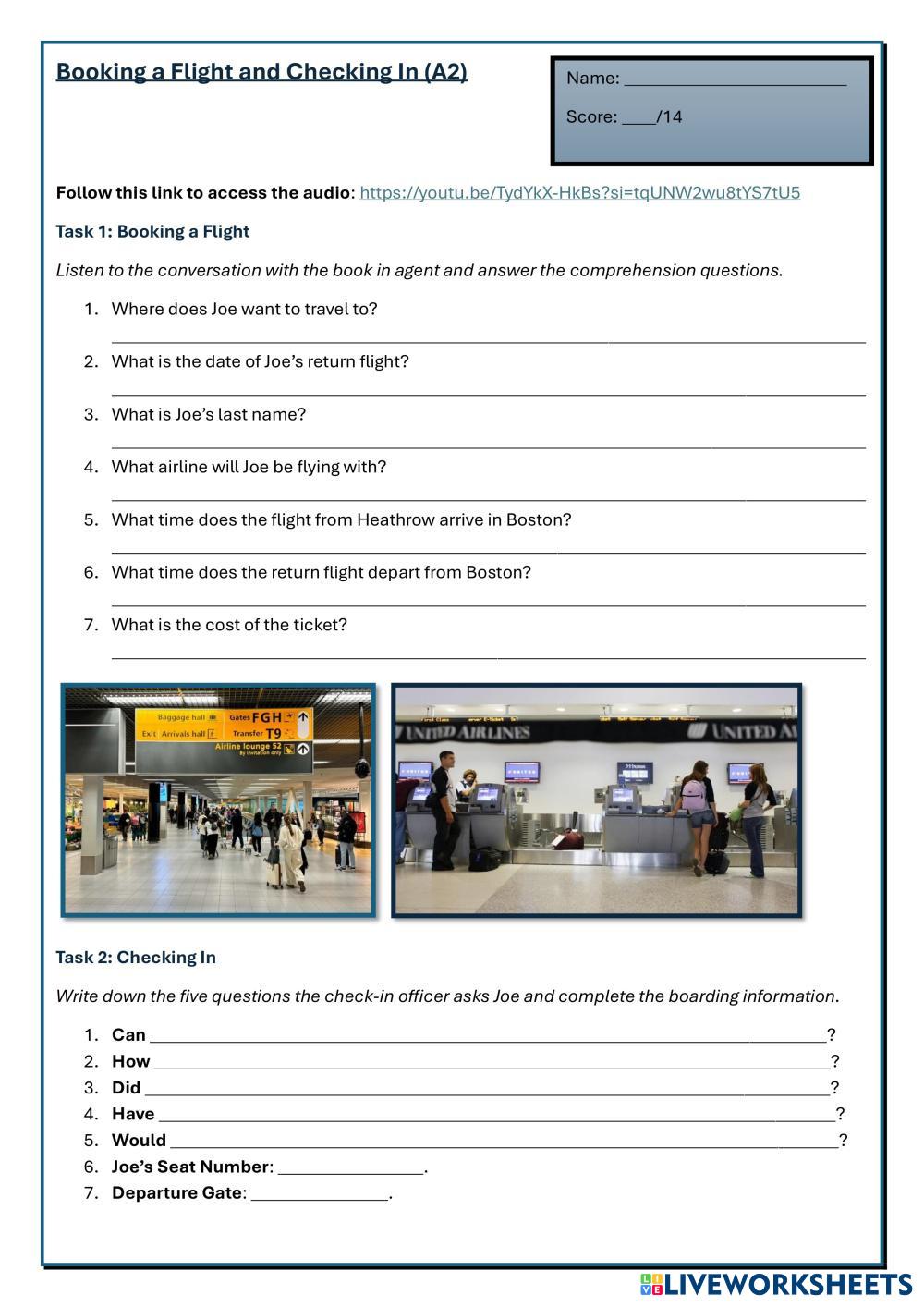 In this worksheet, students will complete two listening tasks. First of all, they will hear a traveller booking tickets, and answer comprehension questions about his flight. After that, they will listen to a conversation at the airport's check-in desk, and write the questions that the check-in officer asks, as well as some other pieces of flight information.