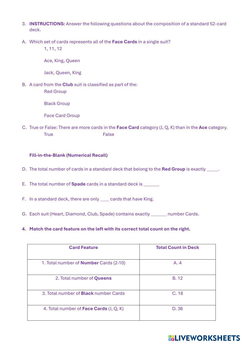 Drag all labels to classify the suits and card ranks, then click the correct options and type the numerical answers for the deck's composition.