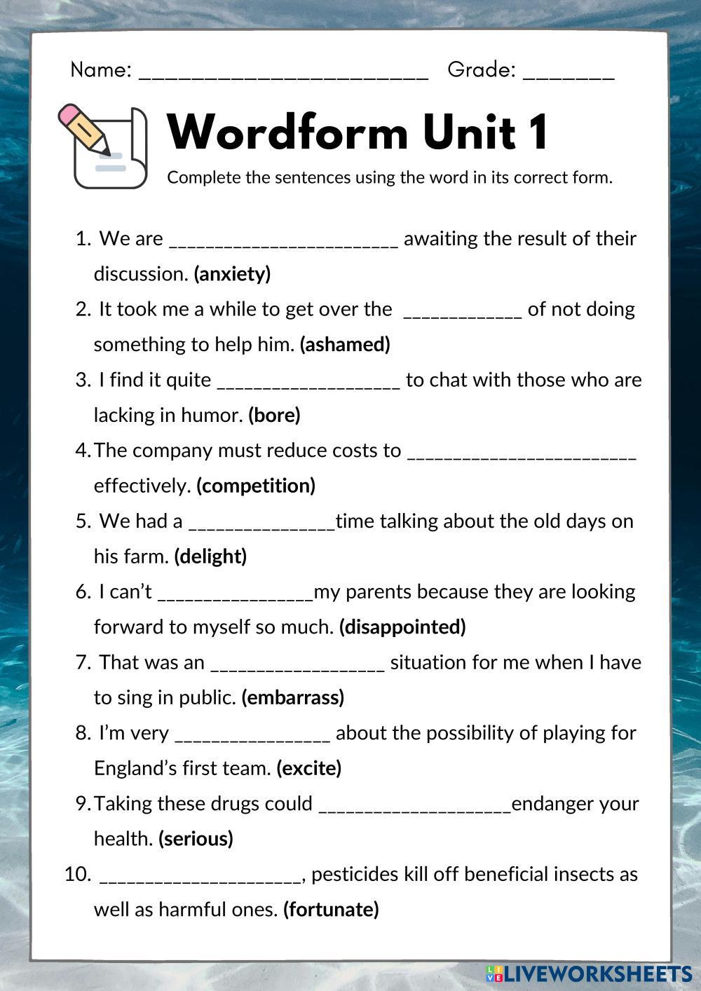 Created byNguyễn Hoàng Phi Wordform Grammar - Wordform Age 15+ level: B1 English คำแนะนำของผู้เขียน My Google Classroom Courses × 0 classes selected (0 students total) Quick Access Select all classes (0 classes) All Classes Loading courses... ยกเลิก Share Share to selected Course __COURSE_NAME__ __STUDENT_NAME__ (__STUDENT_EMAIL__) Word Form – Unit 1: Feelings ดาวน์โหลด Worksheet Validation Check my answers Emails my answers to my teacher ชื่อเต็ม Group/level School subject Teacher's email or key code Close ส่งข้อมูล Validating worksheet... (12) Your answers have been sent to your teacher. Good luck! OK We encountered an error submitting your answers. Please try again. OK โฆษณา | ใช้งานแบบไม่มีโฆษณา Created byNguyễn Hoàng Phi Wordform Grammar - Wordform Age 15+ level: B1 English คำแนะนำของผู้เขียน