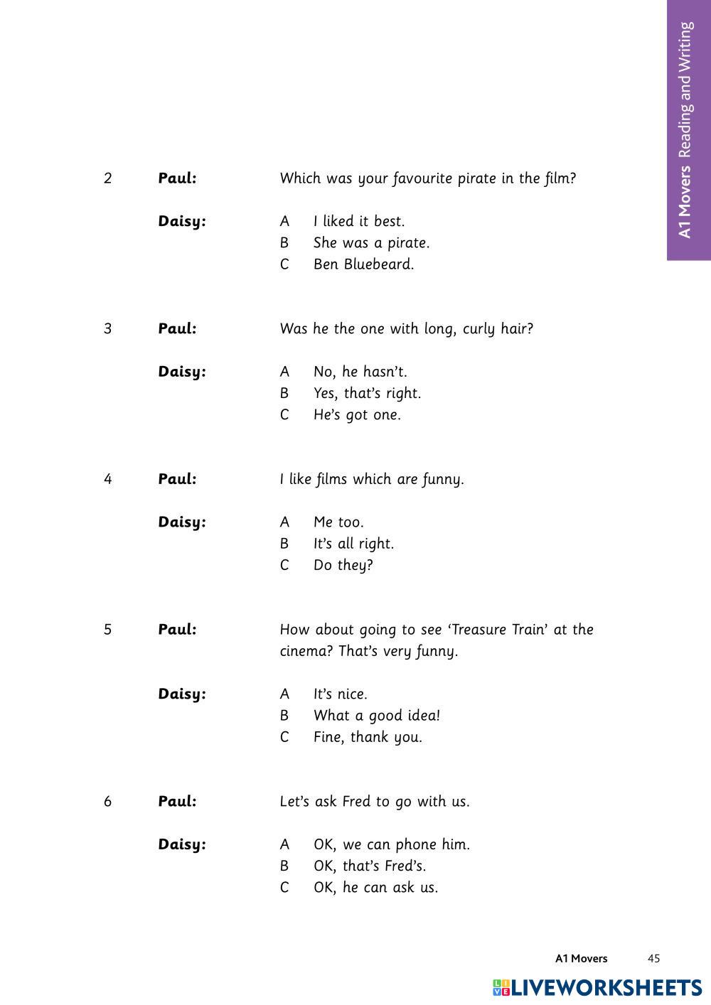 Created by anaamorales15 Cambridge Movers Age 7-17 level: Movers Spanish คำแนะนำของผู้เขียน My Google Classroom Courses × 0 classes selected (0 students total) Quick Access Select all classes (0 classes) All Classes Loading courses... ยกเลิก Share Share to selected Course __COURSE_NAME__ __STUDENT_NAME__ (__STUDENT_EMAIL__) Movers R&W 4,5,6 ดาวน์โหลด Worksheet Validation Check my answers Emails my answers to my teacher ชื่อเต็ม Group/level School subject Teacher's email or key code Close ส่งข้อมูล Validating worksheet... (12) Your answers have been sent to your teacher. Good luck! OK We encountered an error submitting your answers. Please try again. OK โฆษณา | ใช้งานแบบไม่มีโฆษณา Created by anaamorales15 Cambridge Movers Age 7-17 level: Movers Spanish คำแนะนำของผู้เขียน