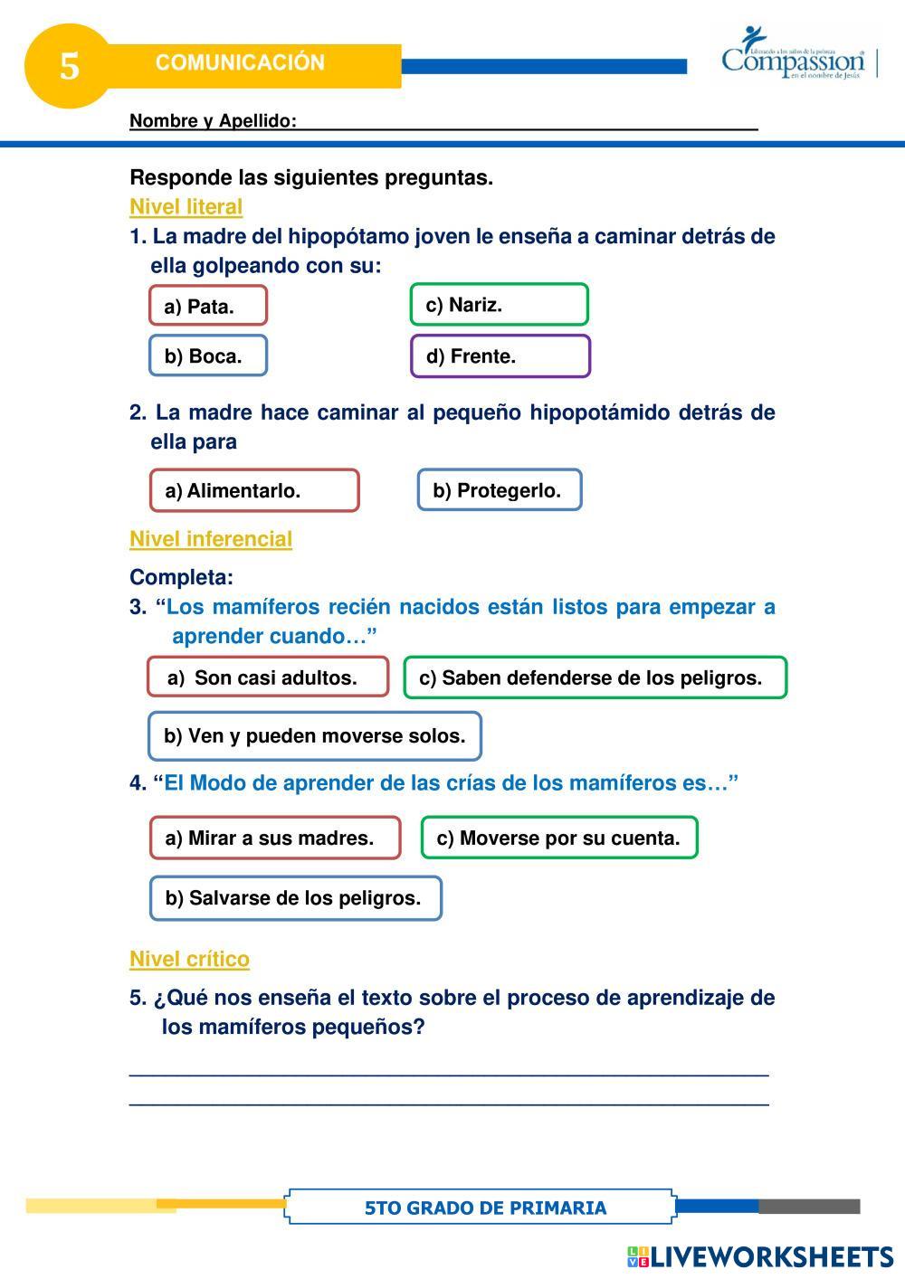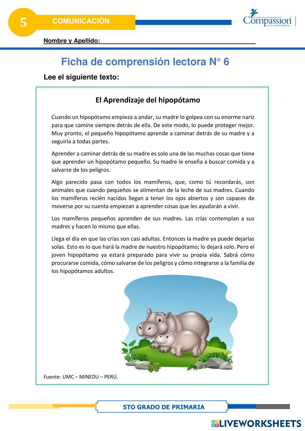 Created byCompassion international del Perú Comunicación Ficha de comprensión lectora 6 Age 10-14 level: 5 Spanish คำแนะนำของผู้เขียน My Google Classroom Courses × 0 classes selected (0 students total) Quick Access Select all classes (0 classes) All Classes Loading courses... ยกเลิก Share Share to selected Course __COURSE_NAME__ __STUDENT_NAME__ (__STUDENT_EMAIL__) Ficha de comprensión lectora 6 ดาวน์โหลด Worksheet Validation Check my answers Emails my answers to my teacher ชื่อเต็ม Group/level School subject Teacher's email or key code Close ส่งข้อมูล Validating worksheet... (12) Your answers have been sent to your teacher. Good luck! OK We encountered an error submitting your answers. Please try again. OK โฆษณา | ใช้งานแบบไม่มีโฆษณา Created byCompassion international del Perú Comunicación Ficha de comprensión lectora 6 Age 10-14 level: 5 Spanish คำแนะนำของผู้เขียน